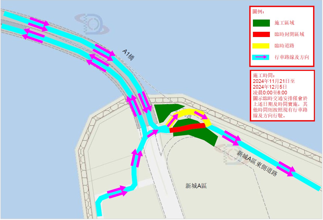 配合友谊圆形地行车天桥第二期建造工程的桥面吊装工作,自2024年11月21日至2024年12月5日(每天凌晨0:00至6:00)实施临时交通措施,驾驶者经A1桥(马万祺博士大马路)进入新城A区后将使用临时道路,部分行车道将改为单线行车,至于由新城A区经A1桥往澳门半岛方向的车道及行驶路线则维持不变 (详见附图) ,请驾驶者留意现场交通指示标志、遵守现场交通警员的指挥及安排。