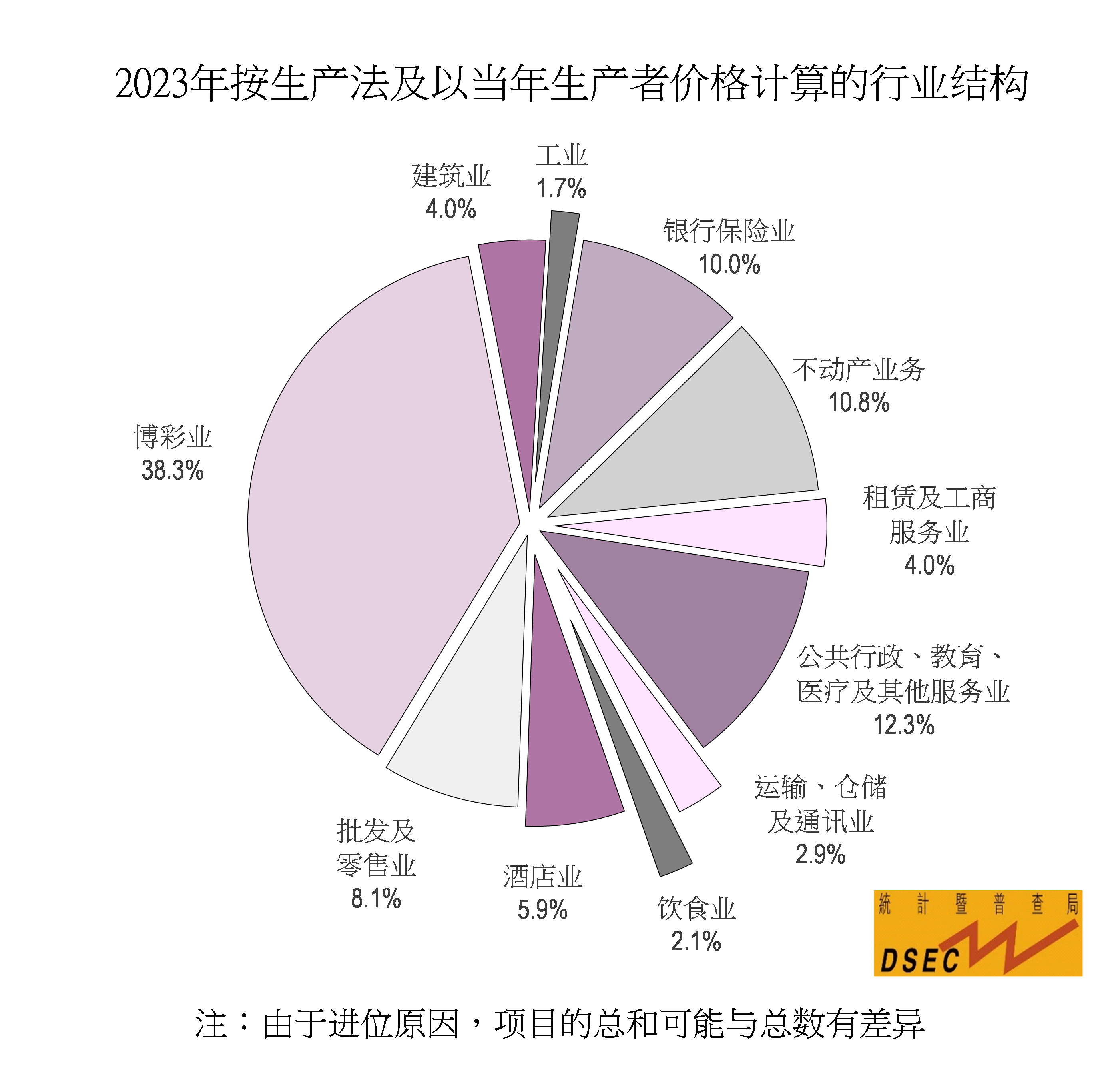 随着本地各类经济活动有序恢复,整体行业增加值总额按年实质上升70.0%。其中,受惠旅游行业的复苏,第三产业的增加值总额实质增长76.4%,当中大部分行业的增加值总额均较2022年有所上升,升幅较显着的包括博彩业(354.8%)、饮食业(112.5%)、酒店业(88.1%),以及批发及零售业(79.4%)等与旅游相关的行业;而第二产业的增加值总额亦实质上升6.8%,当中制造业、水电及气体生产供应业和建筑业的增加值总额分别增加42.7%、8.1%及1.6%。