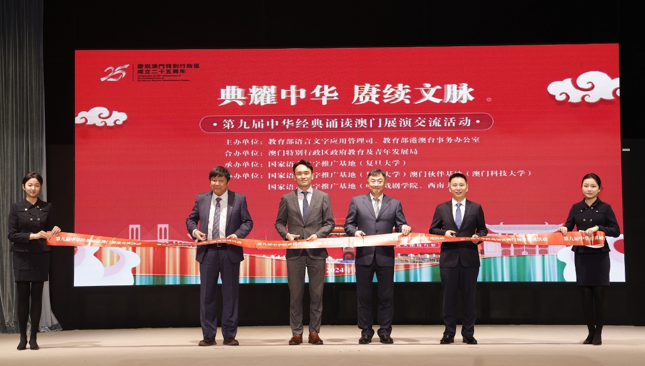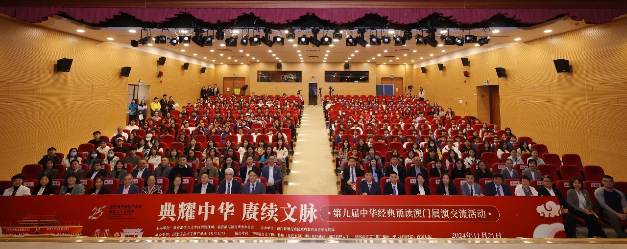 由国家教育部语言文字应用管理司、港澳台事务办公室主办,教育及青年发展局合办,国家语言文字推广基地(复旦大学)承办的“第九届中华经典诵读澳门展演交流活动”于2024年11月21日假澳门科技大学举行。国家教育部语言文字应用管理司副司长王晖、教育及青年发展局局长龚志明、中央人民政府驻澳门特别行政区联络办公室教育与青年工作部副部长李勇先、澳门科技大学副校长庞川、澳门中华教育会副理事长吕绮颖、澳门高等教育发展促进会长莫启明、澳门天主教学校联会理事长刘丽妹、澳门公职教育协会监事长谭可珍等,以及澳门各中小学学校代表及逾四百名师生出席。