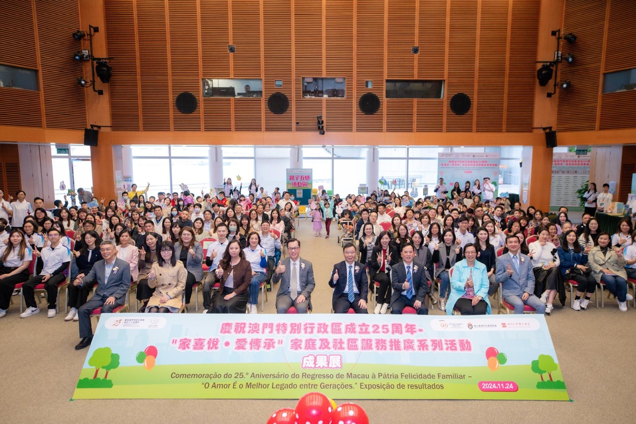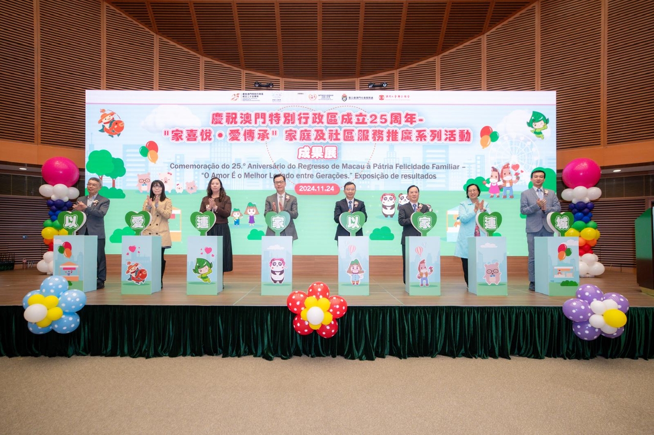 2024年为国际家庭年30周年及澳门特别行政区成立25周年,社会工作局联同澳门工会联合总会、圣公会澳门社会服务处,以及6个“分区协作联网”共40多间社服机构,于今(24)日假澳门科学馆会议厅举办庆祝澳门特别行政区成立25周年 -“家喜悦‧爱传承”家庭及社区服务推广系列活动成果展,由社会工作局邓玉华副局长、中央人民政府驻澳门特别行政区联络办公室社会工作部赵河清副部长、教育及青年发展局蔡敏芝代副局长、法务局行政及财政管理厅李胜里厅长、文化局读者服务及推广处林颖娜处长、卫生局余斌护士长、澳门工会联合总会张国然副会长、圣公会澳门社会服务处叶鉴波服务总监主持启动仪式。现场设有亲子沉浸式互动剧场、时光走廊体验、图画填色摊位、家庭教育成品展示、吉祥物拍照,以及活动主题微电影“以爱连城”首映等,共有800人次参与。