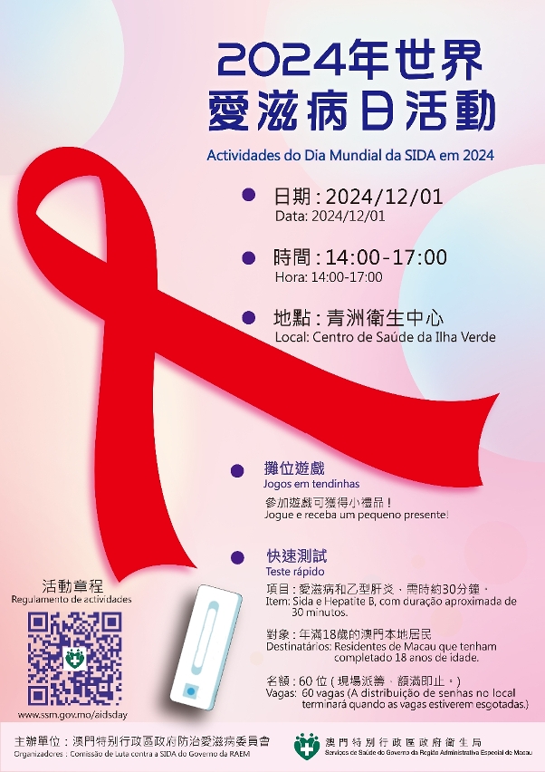 为提升居民对爱滋病的认识和关注,12月1日下午2时至5时,卫生局于青洲卫生中心地面层举办“世界爱滋病日”活动,设有检测环节,包括爱滋病及乙型肝炎快速测试(名额有60个),对象为不清楚自己是否感染爱滋病毒或乙型肝炎病毒的年满18岁澳门居民;另外,同场设有摊位游戏,欢迎有兴趣居民参加。