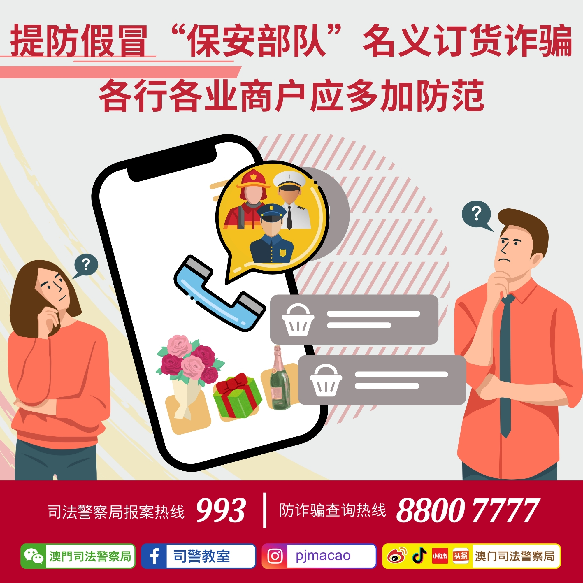 近日司法警察局接到本澳多间不同行业的商户通报,指有骗徒假冒澳门保安部队人员,透过社交软件向商户发送讯息咨询报价,其后再要求商户协助向指定供应商代订特定商品(如花蓝、红酒或床褥)。代订前,骗徒再向商户发送伪造之转账截图,讹称已支付全部货款,诱骗商户向假冒之供应商支付订金,所幸相关商户及时识破骗局最终没有被骗。