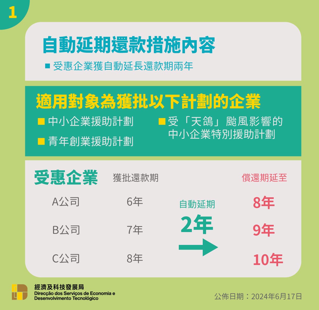 为纾缓中小企业偿还贷款的压力,特区政府透过第22/2024号行政法规,将上述计划的还款期上限由8年延长至10年,相关措施于2024年6月18日起生效。经科局以有序分批的方式,透过手机短讯及公函通知各受惠企业有关调整还款期的安排,受惠企业无须提出申请,藉以达到便民便商之目的。