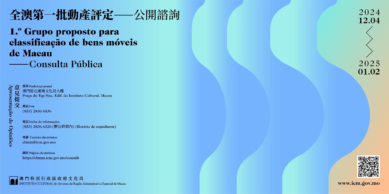 为履行第11/2013号法律《文化遗产保护法》规定,推动澳门具重要文化价值的动产的保护和管理工作,文化局现正进行为期30天的“全澳第一批动产评定”公开咨询,公开咨询期为2024年12月4日至2025年1月2日,欢迎公众在咨询期内发表宝贵意见。
