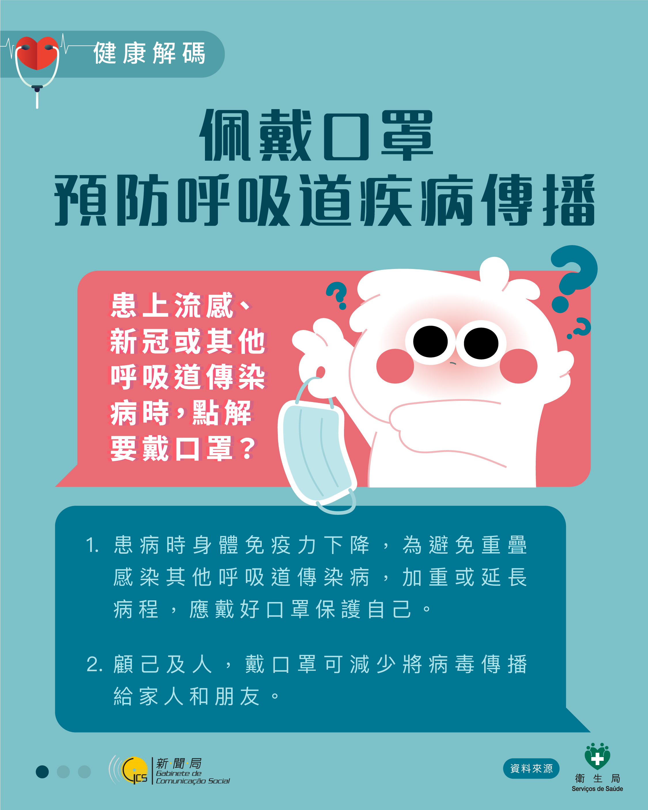 本澳正值流感高峰期,居民若有发烧、咳嗽等呼吸道不适症状时,身体抵抗力便会下降,外出时应配戴口罩,以预防重叠感染其他呼吸道传染病,避免病情加重,并可减少疾病传播。即使身体无不适,外出时亦可随身带备口罩,以便有需要时戴上,预防感染呼吸道传染病。