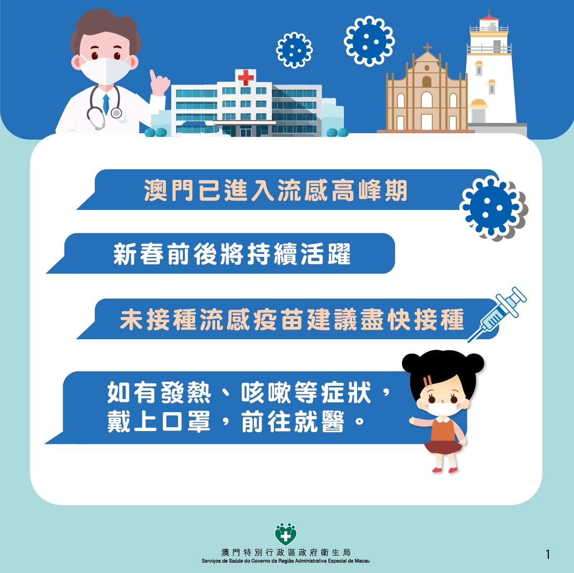 学校方面,随着流感季节及春节假期将至,教青局将于明(15)日与全澳学校举行会议,提醒学校做好校园清洁和预防工作,保持校园环境卫生清洁及空气流通,加强健康教育。此外,学校应持续了解春节假期前后学生的身体情况。家长亦须时刻留意子女的身体状况,尤其新春假期计划外游时,须注意提高卫生意识,如有不适应尽快就诊及留在家中休息,及时通知学校子女的情况。
