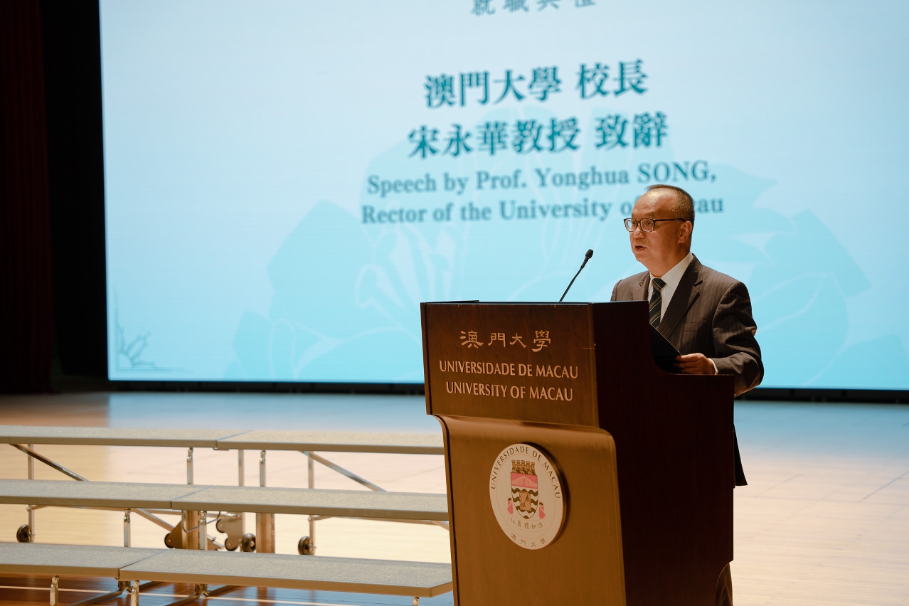 典礼上,澳大校长宋永华、澳门特别行政区政府教育及青年发展局学生厅厅长陈旭伟监誓。宋永华致辞时感谢历届学生会热诚真切的态度与付出,并期望新就任的学生会和属会成员能够为一众学生提供更多拓宽视野、提高涵养、锻炼才干、施展抱负的舞台和机会,同时为澳门、为国家作出更多贡献。