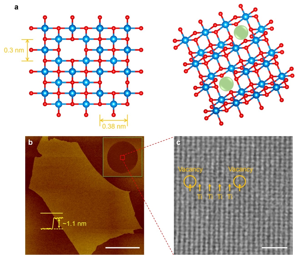 是次研究以“通过埃级多孔氧化钛实现高质子传导率(High proton conductivity through angstrom-porous titania)”为题,开创性地采用埃级多孔氧化钛二维晶体作为超薄质子交换膜。研究团队通过层间阳离子交换结合液相剥离法制备氧化钛二维晶体(图1,a-b),同时在其表面引入高密度、尺寸分布均匀的埃尺度原子孔,为高密度原子级孔道的精确构建提供新思路。