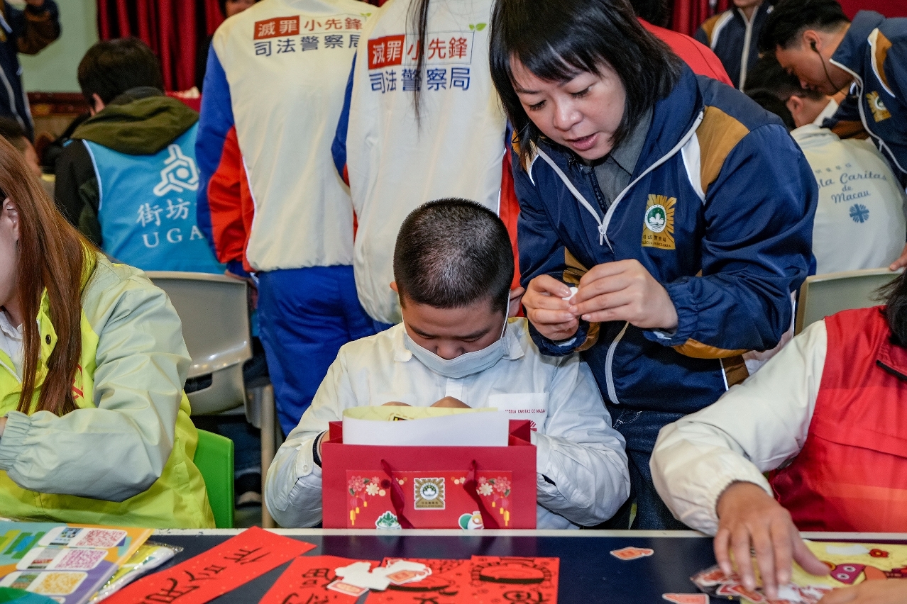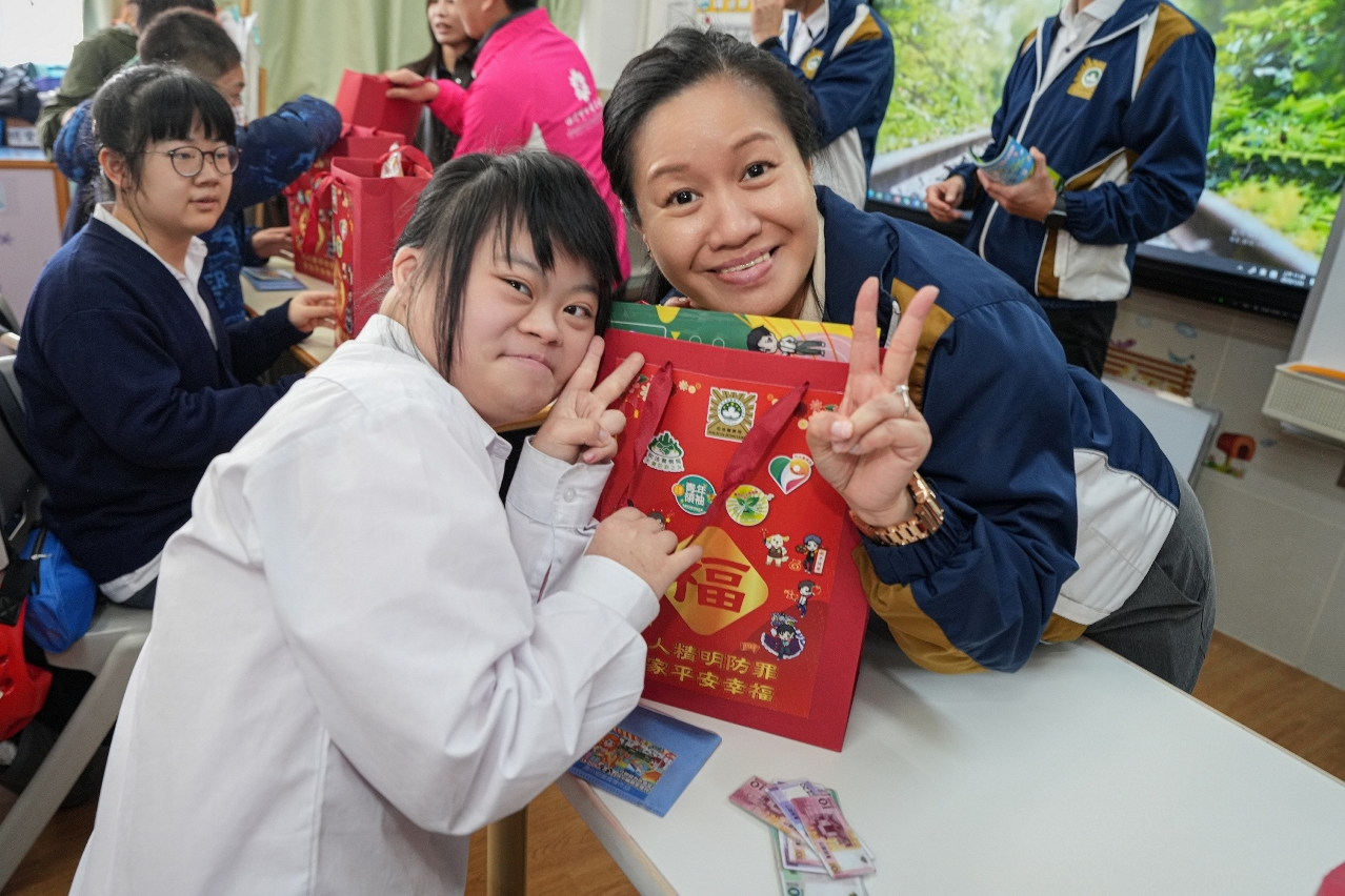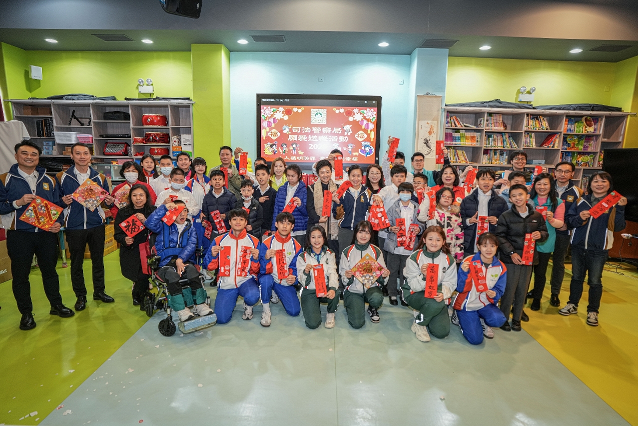 为弘扬关爱共融和奉献精神,并向社会大众传递支持与关怀复康人士的正面讯息,司法警察局联同“大厦防罪之友"和“妇女防罪之友"成员、“社区安全青年领袖计划"及“灭罪小先锋种子计划"(下称“两项青年计划")学员前往明爱学校探访学童,送上新春福包和节日祝福,祝愿他们新年快乐,健康成长。