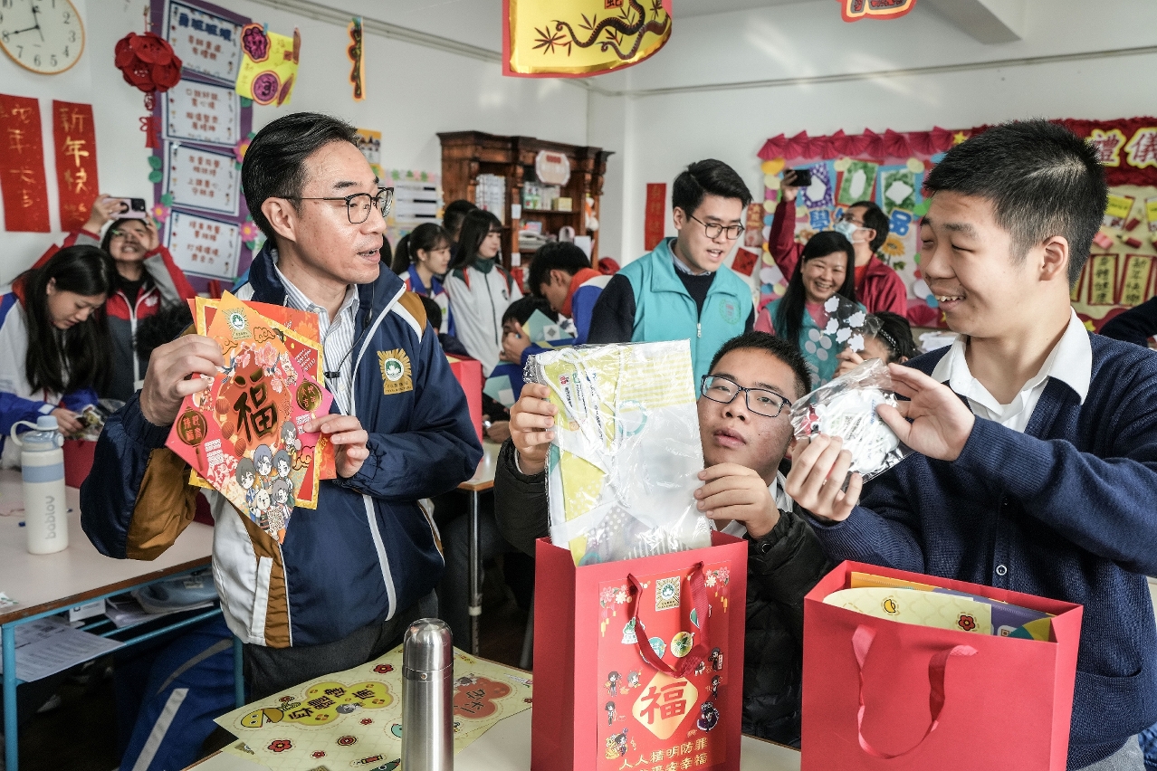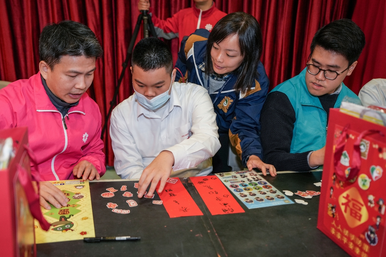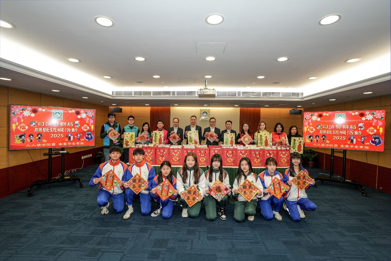 为弘扬关爱共融和奉献精神,并向社会大众传递支持与关怀复康人士的正面讯息,司法警察局联同“大厦防罪之友"和“妇女防罪之友"成员、“社区安全青年领袖计划"及“灭罪小先锋种子计划"(下称“两项青年计划")学员前往明爱学校探访学童,送上新春福包和节日祝福,祝愿他们新年快乐,健康成长。