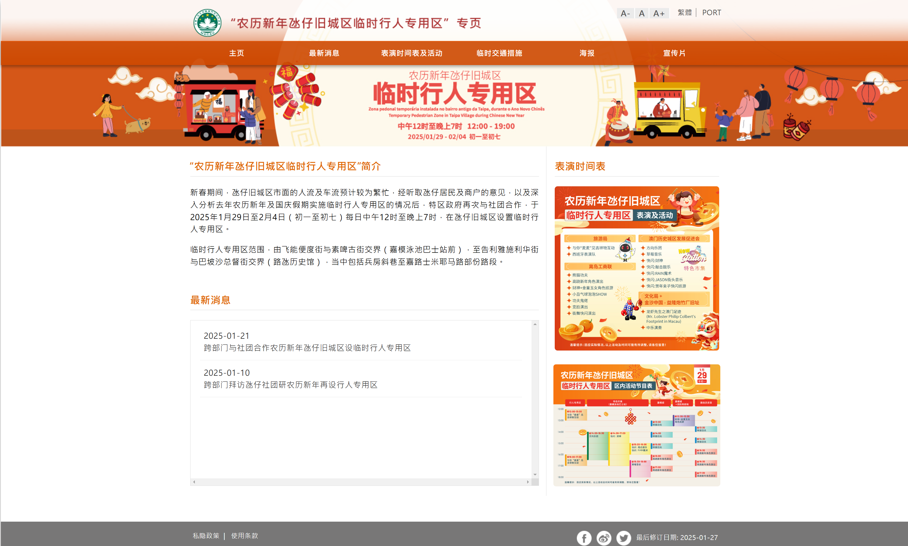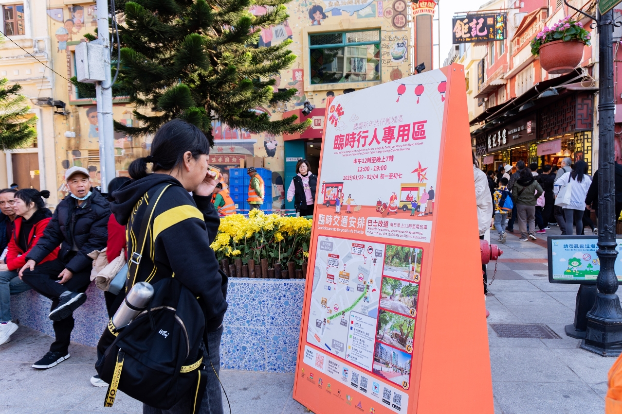 为确保新春期间氹仔旧城区人流及交通有序通行,营造舒适安全的环境,经济及科技发展局、交通事务局、治安警察局、旅游局、文化局及市政署,联同澳门街坊会联合总会、氹仔社区发展促进会、氹仔坊众联谊会及澳门离岛工商业联合会合作设置“农历新年氹仔旧城区临时行人专用区”。