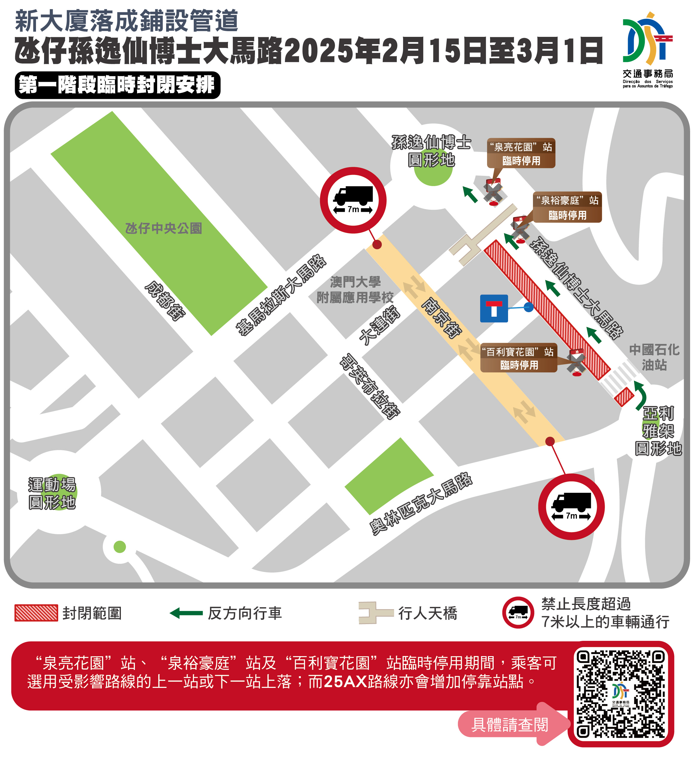 因应有新大厦落成须进行工程连接管道,介乎亚利雅架圆形地与孙逸仙博士圆形地的一段氹仔孙逸仙博士大马路自2月13日起实施临时交通措施,并于2月15日至3月15日期间分阶段实施封闭交通,24条巴士线受影响。