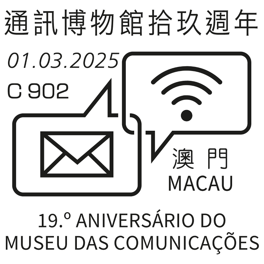 为庆祝通讯博物馆成立拾玖周年,邮电局特于二零二五年三月一日,分别于邮政总局集邮商店及通讯博物馆商店设置临时柜台,为市民提供加盖“通讯博物馆拾玖周年”纪念邮戳服务,服务时间如下: