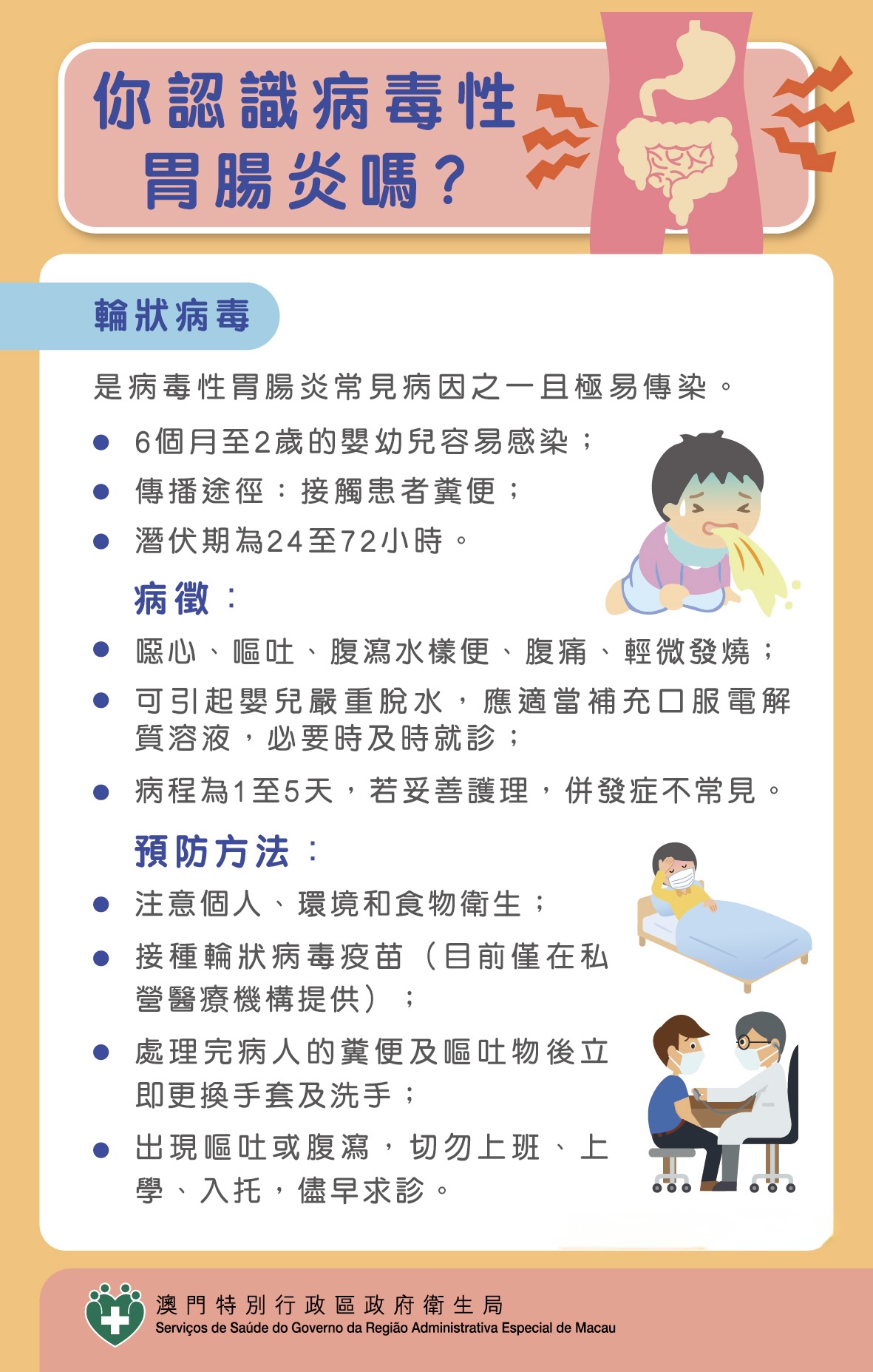 综合上述监测资料显示,本澳急性胃肠炎感染仍处于活跃阶段。急性胃肠炎通常可由病毒或细菌等不同致病原引起,常见病原体包括诺如病毒(诺沃克样病毒)、轮状病毒、沙门氏菌等。潜伏期由数小时至数日不等,因不同致病原而有所不同。一般病情较轻,致病原须由实验室检测才能证实,治疗以对症支持为主。病毒性胃肠炎的传播途径、常见病征及预防方法如下: