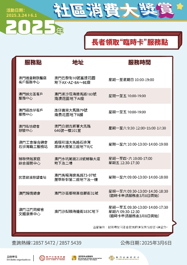 为配合“2025年社区消费大奖赏”增设的长者消费立减优惠活动,并协助持旧版长者卡的巿民更换新卡,经科局联同社工局协调社服机构及社团在全澳设置逾60个换卡服务点已于昨(6)日正式启动,截至3月7日下午五时已有逾5,200名市民完成办理换卡或遗失卡补领手续,当中约两成长者已办理临时卡。
