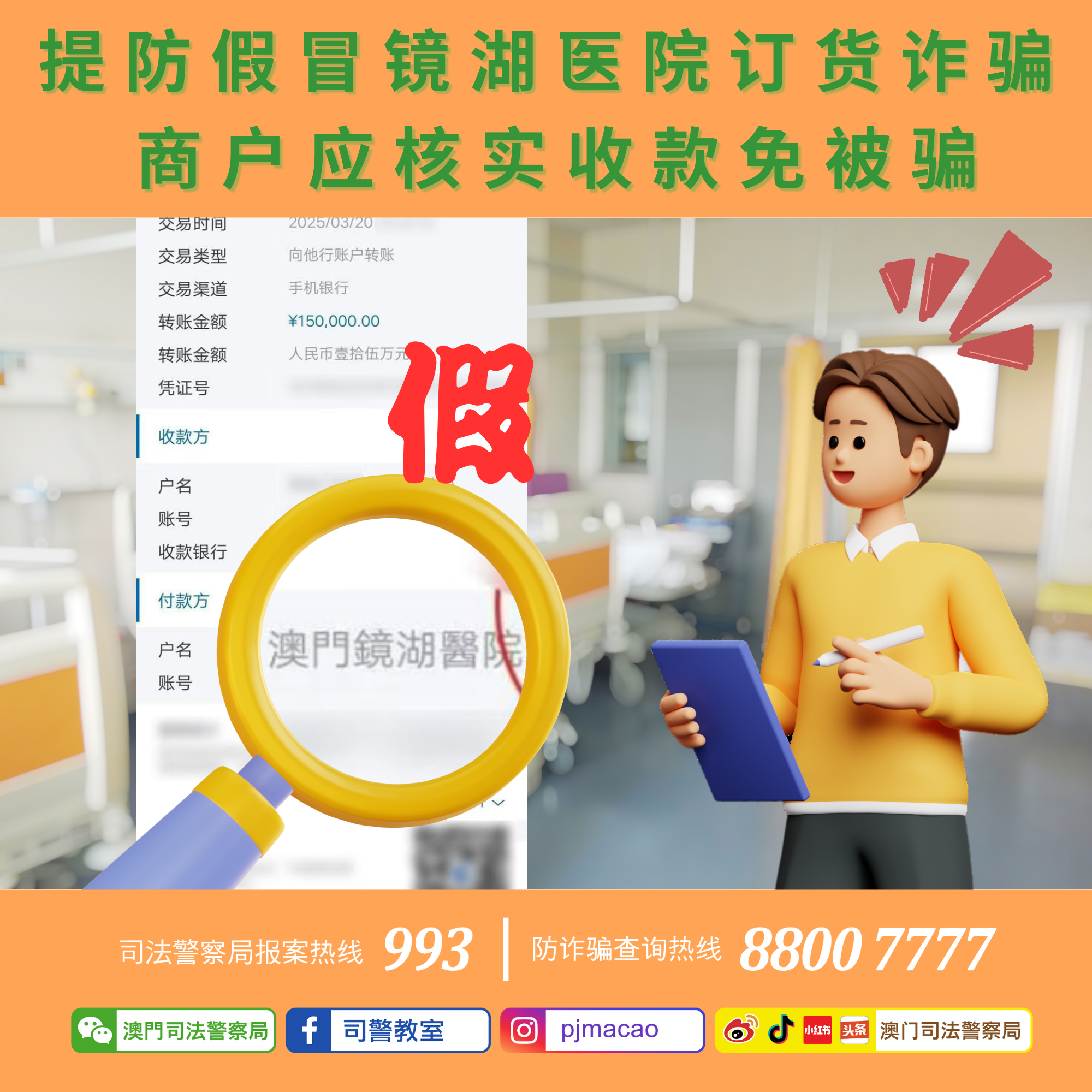 司警局今日发现,有骗徒冒充“镜湖医院职员”致电本澳某美容院,声称欲订购大量美容套餐。为博取信任,骗徒向美容院提供虚假的“转账截图”,让店主误以为款项已支付。