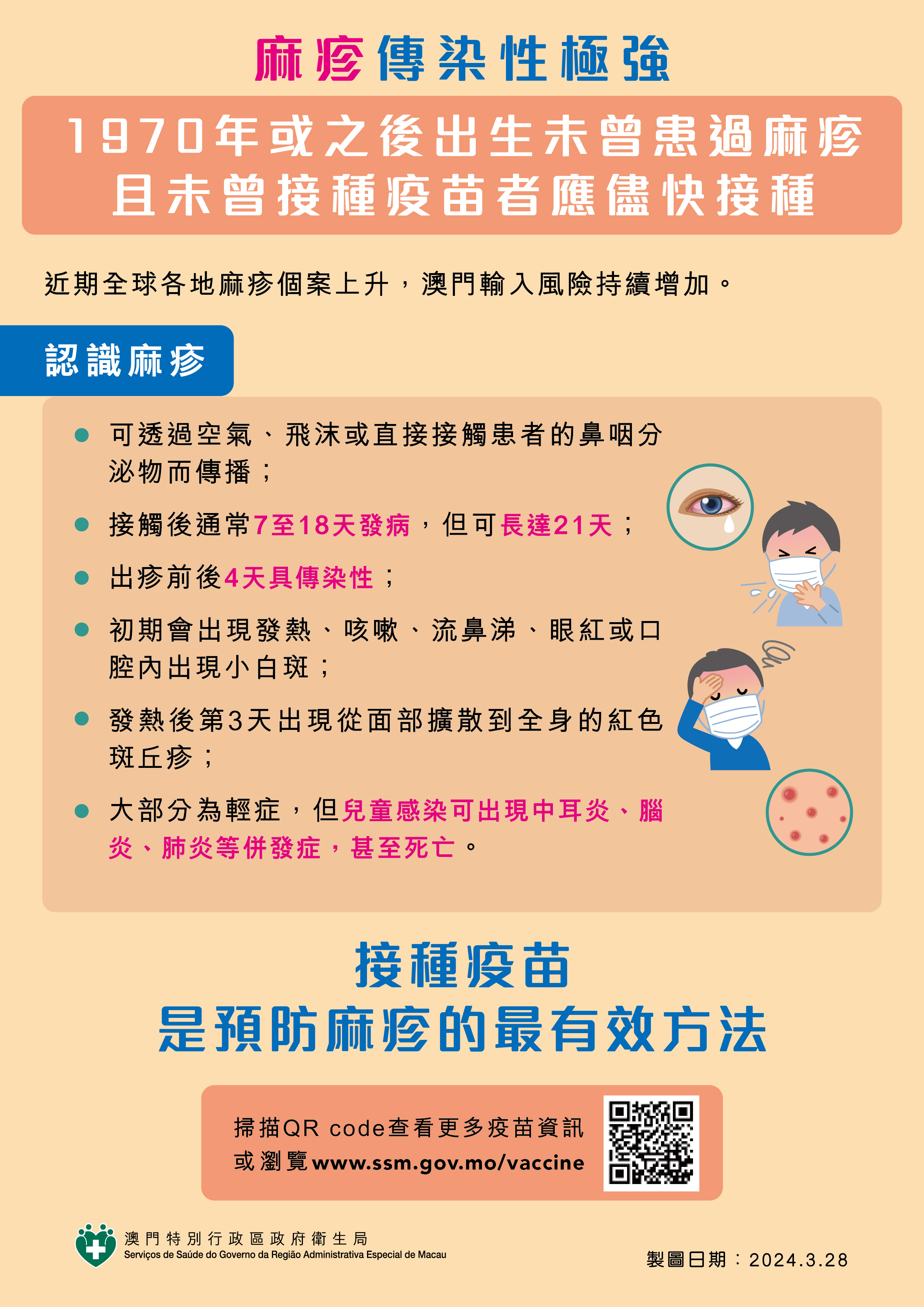 随着清明节及复活节公众假期临近,预计有不少居民会外出扫墓或旅游,因应近期全球各地麻疹个案呈现不同程度的上升,卫生局特别提醒计划前往流行地区的居民注意防范,尚未具备麻疹免疫力人士应提前至少两周完成麻疹疫苗接种;并呼吁未完成两剂麻疹疫苗接种的儿童及不具免疫力的孕妇避免前往麻疹流行地区,以降低感染风险。