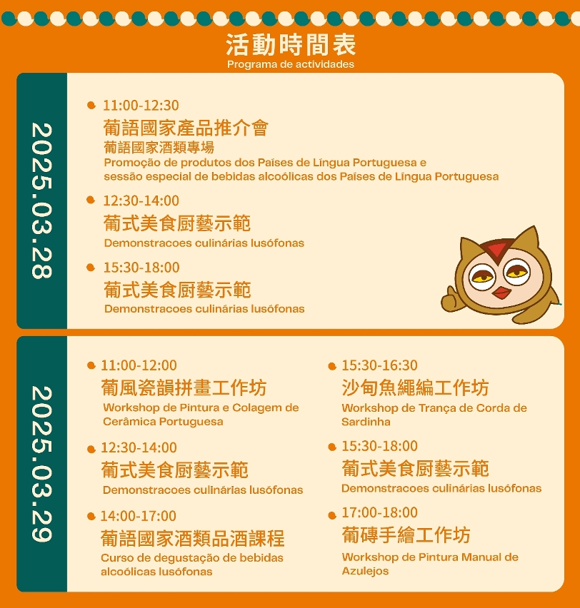 活动更围绕葡语国家文化和特色产品策划多项精彩安排。首日活动将推出葡语国家酒类产品推介会,汇聚各式葡语国家佳酿,集中进行商贸洽谈;还将举办葡式美食厨艺示范,邀请澳门网络达人厨师现场烹饪葡国鸡、薯丝塔等葡式美食。
