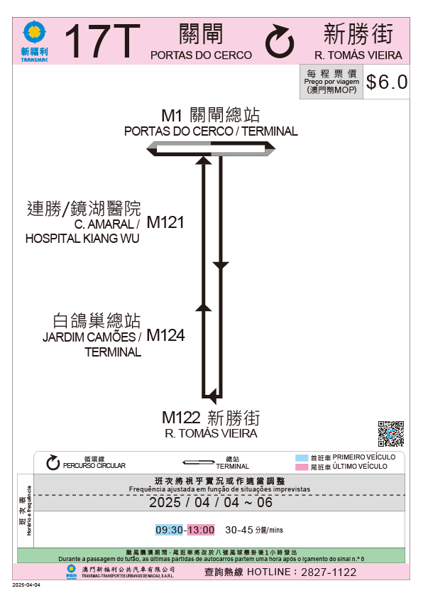 因应内地清明节假日连假,为疏导客流,交通事务局提前协调两巴在关闸广场、路氹城一带、妈阁交通枢纽及港珠澳大桥口岸实施时节性的巴士服务安排,两巴于4月4日至6日指定时段营运时节性路线17T、21AT、26AT及101X特班车(101XS)路线(具体营运资料可查阅附图),亦会派员到主要站点,维持秩序和指引乘客。此外,局方亦协调港澳跨境巴士于清明节期间加密班次,应对客流。