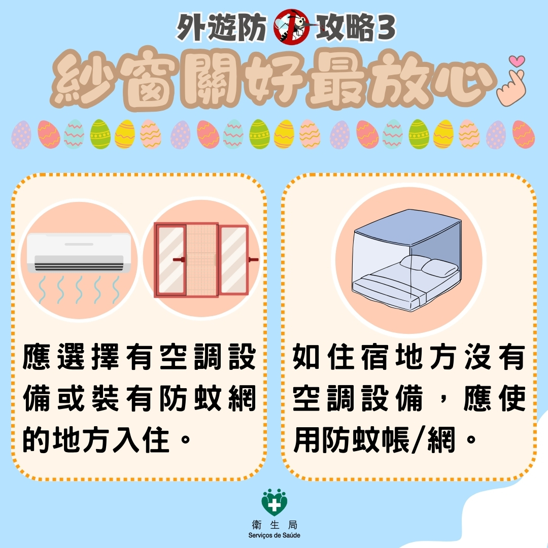 应选择有空调设备或装有防蚊网/纱窗的地方入住;若住宿处没有空调设备,应使用防蚊帐/网。