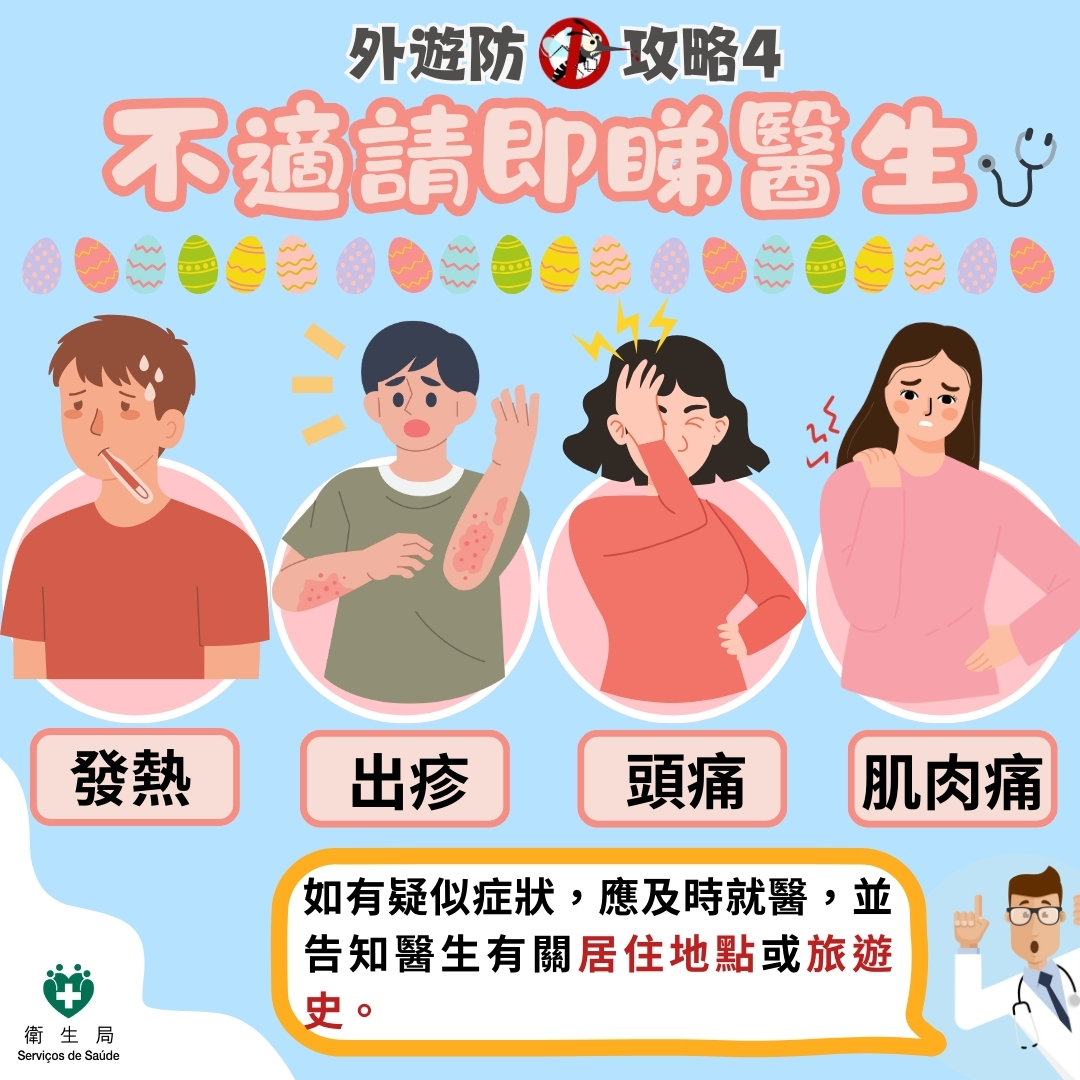 在旅行中或回澳后出现发热、皮疹、头痛或肌肉痛等不适症状,应及时就医及向医生告知近期的旅行史,以便作出适当诊断和治疗。