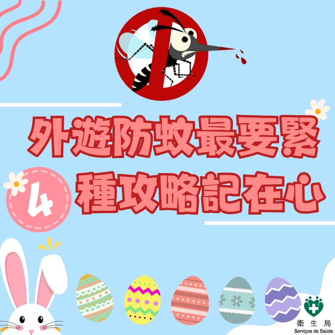复活节假期临近,近日天气回暖且雨水增多,病媒蚊的活动也趋于频繁。蚊子传播的常见疾病,如登革热、日本脑炎、黄热病和疟疾等,目前仍在邻近地区或其他地方流行。因此,居民在此期间若外游或参与户外活动,应注意做好以下防蚊措施: