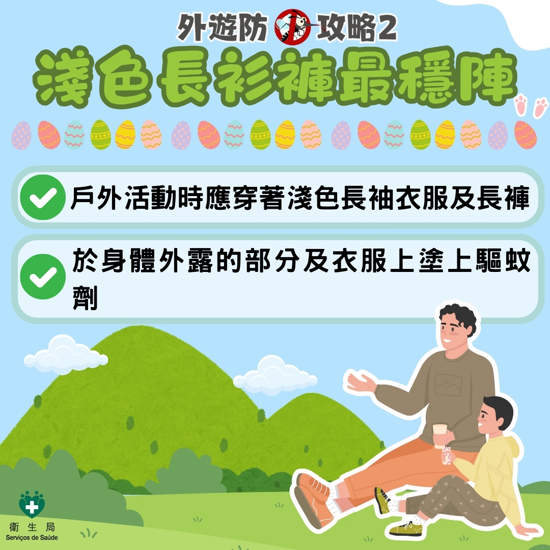 户外活动或外游时应穿着宽松、浅色的长袖上衣及长裤,避免被蚊子叮咬。