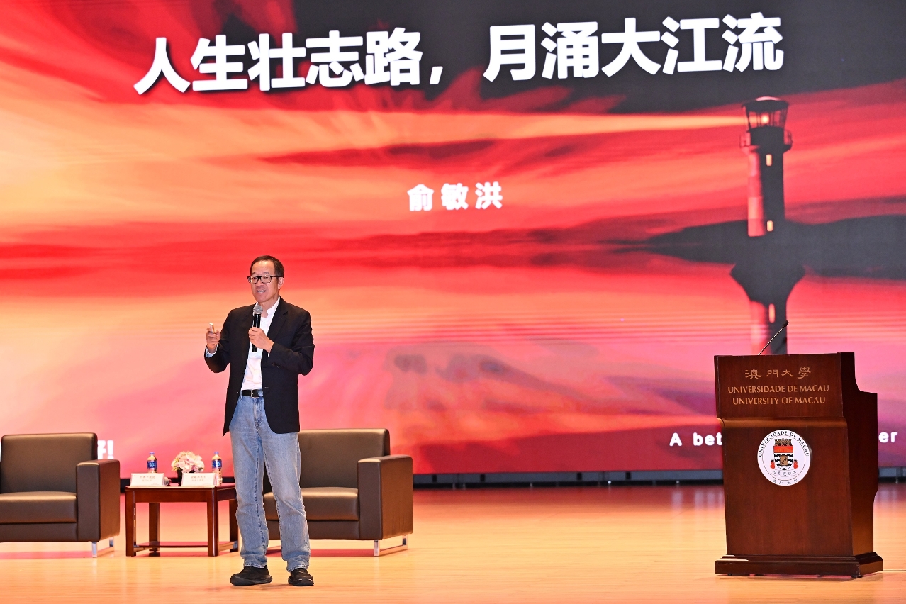澳门大学今(14)日举办大学讲坛暨东望洋讲堂,由新东方教育科技集团董事长俞敏洪以“人生壮志路,月涌大江流”为题发表演讲,分享如何将挑战转化为成长动力、如何在逆境中保持定力。