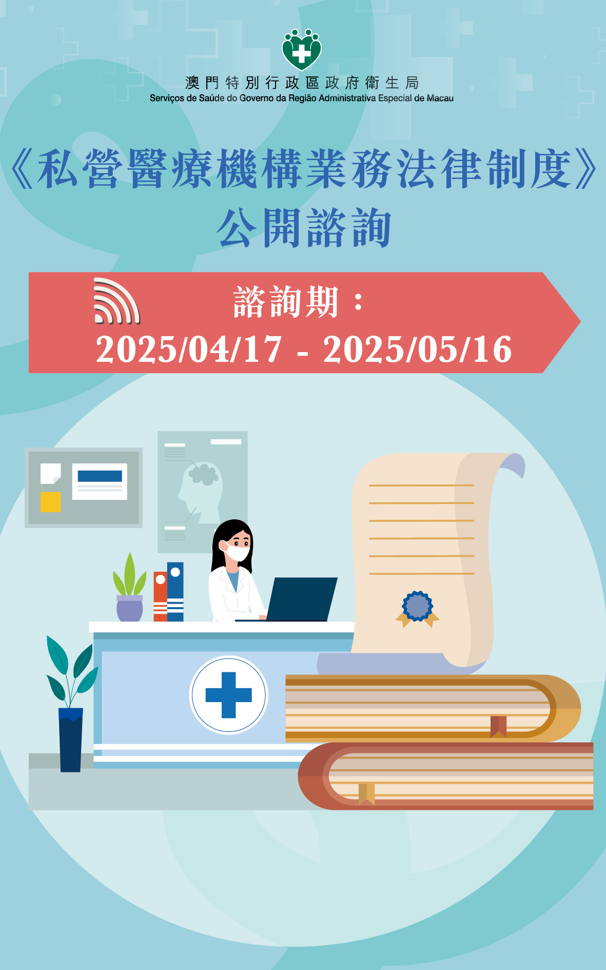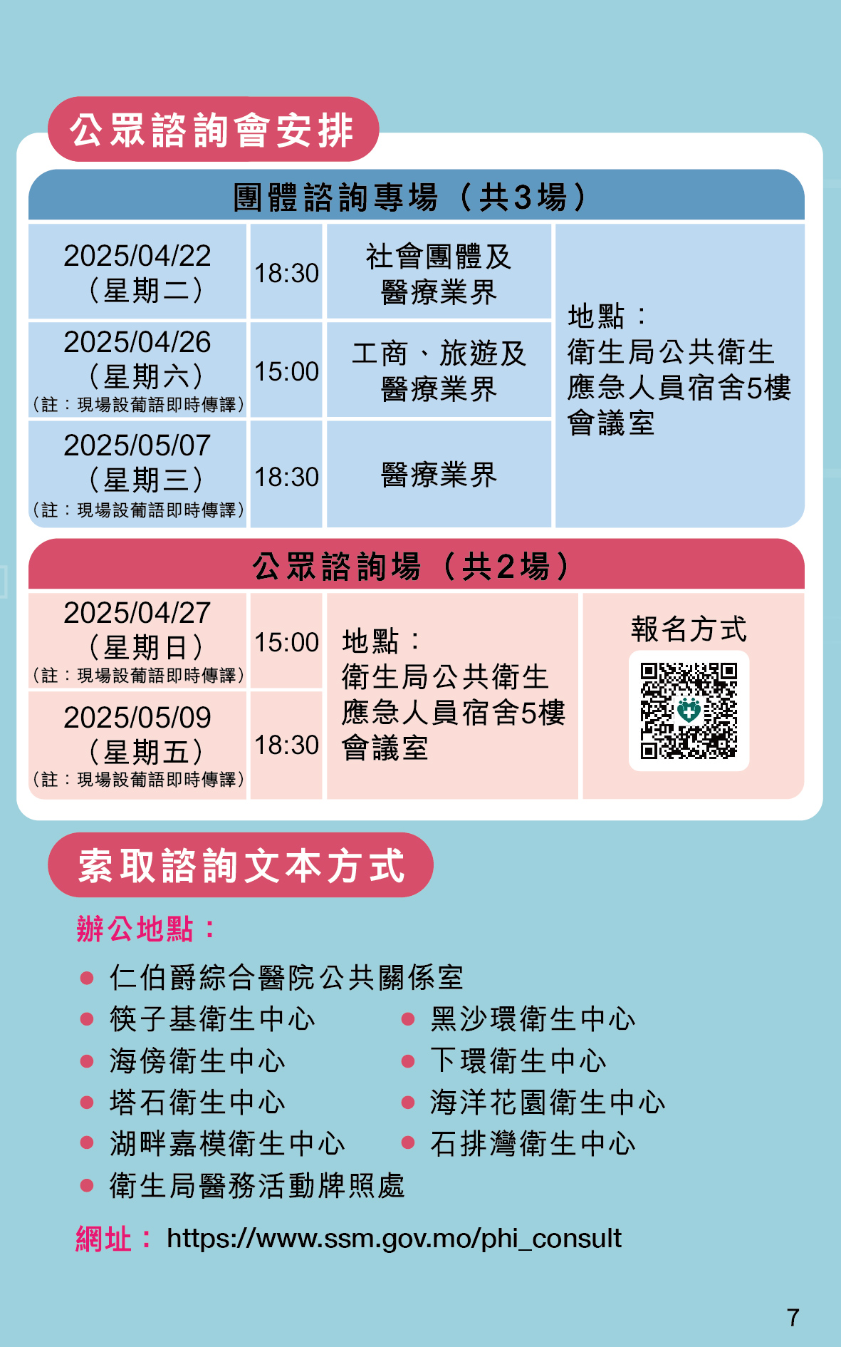 此外,卫生局于4月17日至5月16日期间举办共5场咨询会(详情请参阅海报),向社会各界介绍公开咨询的内容,有意参加的人士可透过公开咨询专题网页或扫描海报二维码了解详情。
