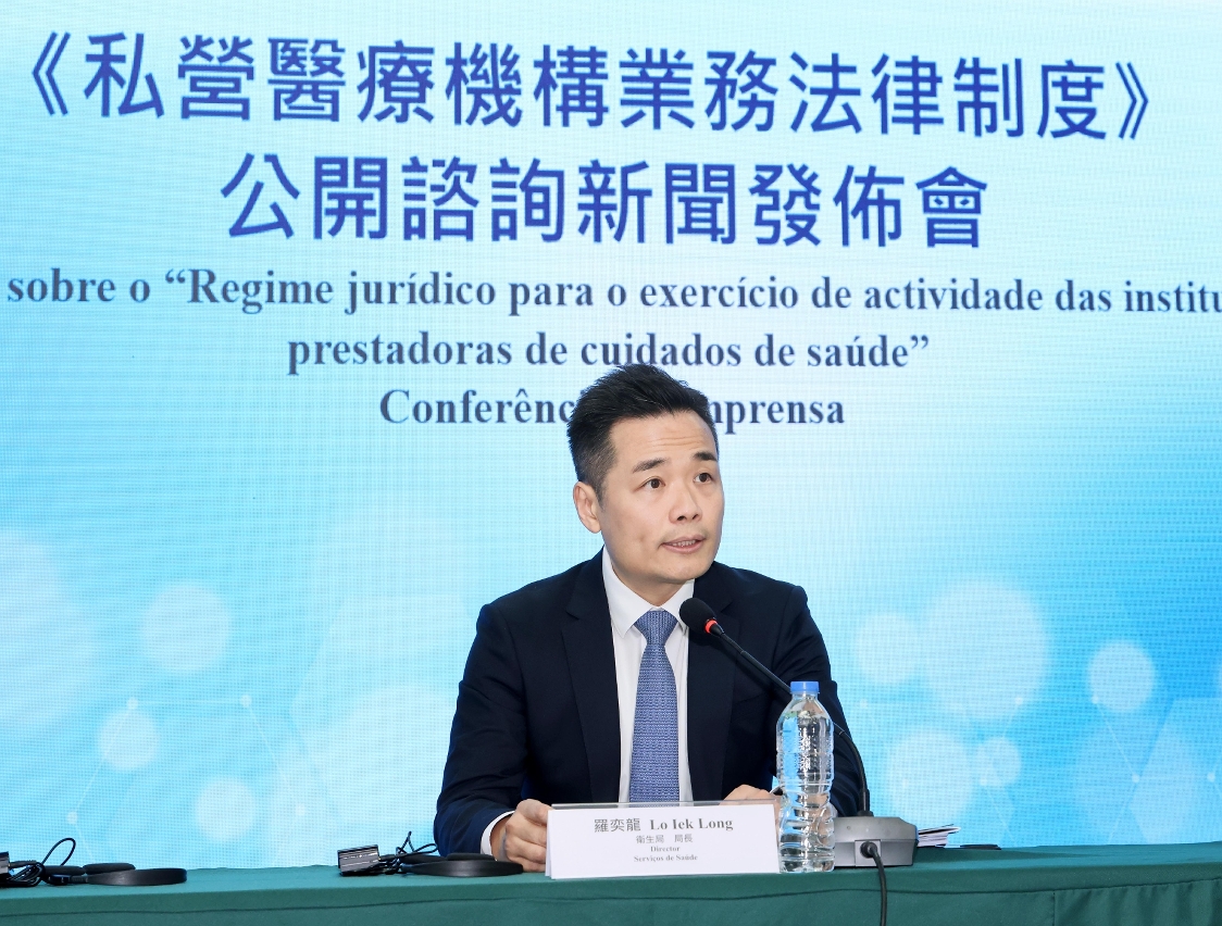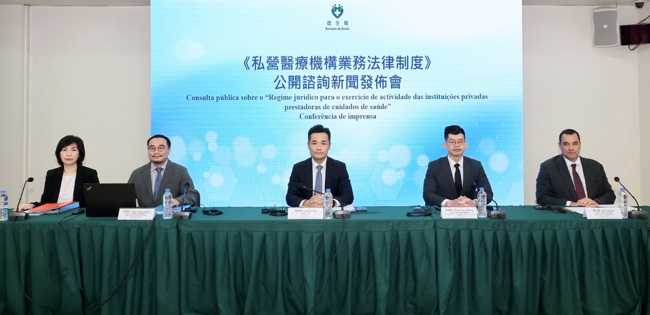 卫生局今(16)日举行新闻发布会,宣布于4月17日至5月16日期间就《私营医疗机构业务法律制度》展开为期30天的公开咨询,并举办5场公众咨询会。卫生局局长罗奕龙、仁伯爵综合医院医务主任彭蓬光、医务活动牌照处处长黄焯鹏、医务委员会秘书长梁佩珊及卫生局法律办公室协调员夏利乐共同出席了新闻发布会。