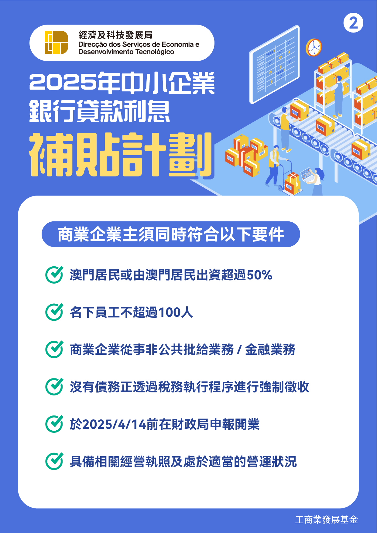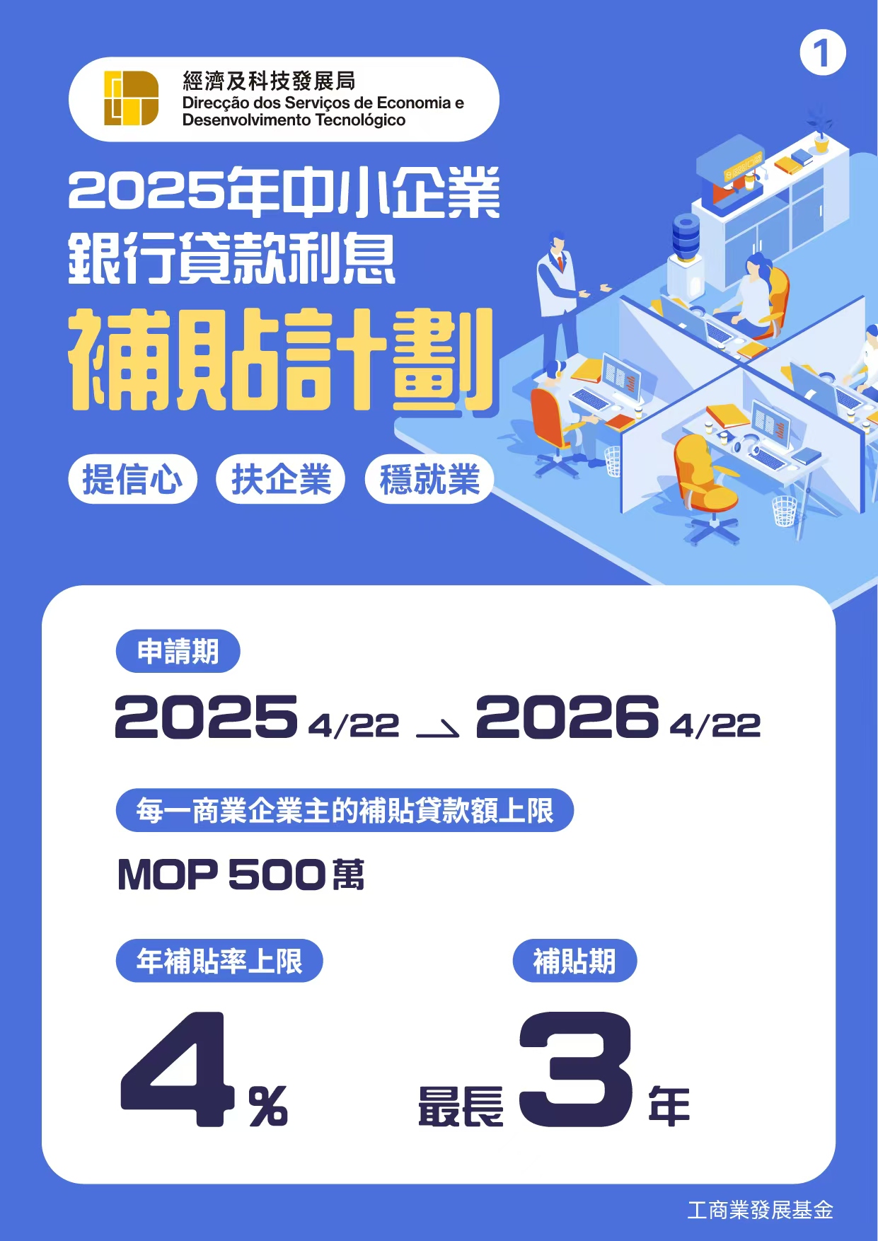 凡符合资格的中小企业,于2025年4月22日至2026年4月22日期间,获得由澳门持牌银行批准用于企业营运的资金贷款,可透过银行申请贷款利息补贴,每一商业企业主的贷款额上限500万澳门元,补贴期最长3年,年补贴率上限4厘,银行贷款额总额上限100亿澳门元。