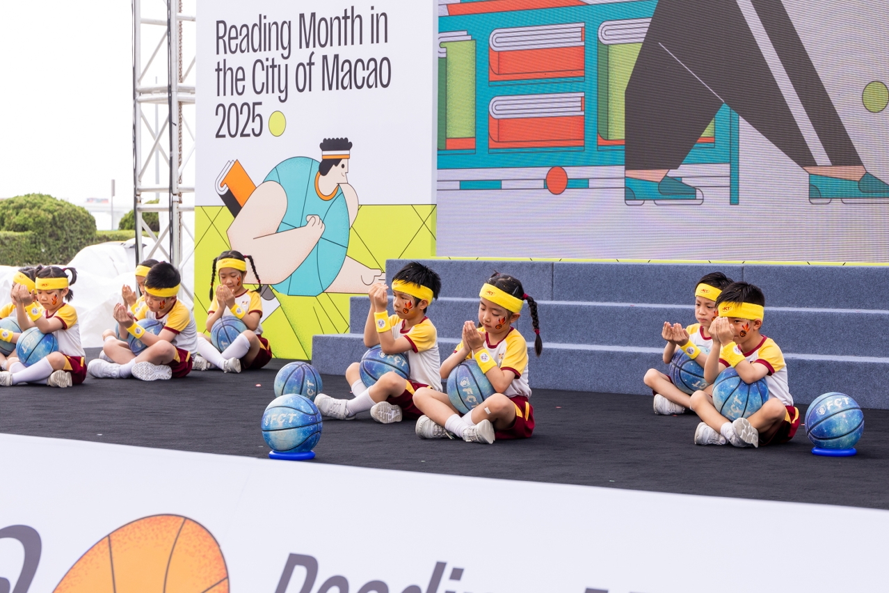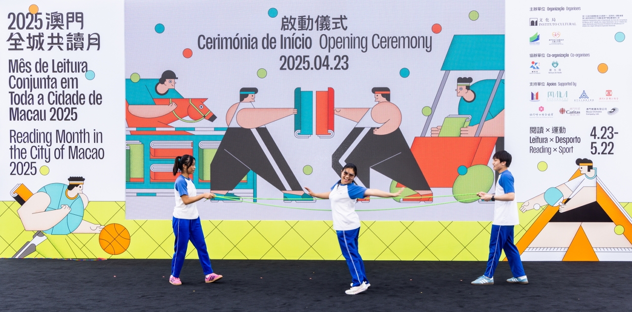 “共读月”系列活动今年以“阅读 × 运动”为主题,启动仪式上分别由氹仔坊众学校及高美士中葡中学的学生表演“书中自有篮球梦”——篮球操及花式跳绳,藉与主题相契合的体育表演为系列活动揭开帷幕。系列活动结合全民阅读与全民健身的理念,旨在将阅读融入生活,让智慧与健康相得益彰。同时,今年继续联动深圳、广州、东莞、香港、南宁及海口,共同举办“粤港澳桂琼‘共读半小时’阅读活动”,现场邀请教业中学的学生进行领读,与一众嘉宾及参加者以共读的方式连结各个城市,让各地民众能透过阅读促进瞭解与交流,共同享受阅读乐趣。