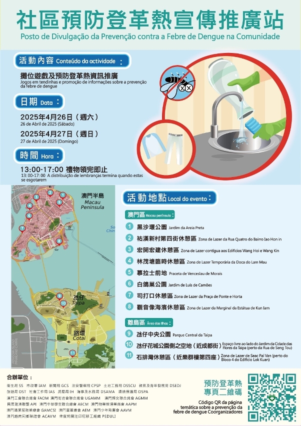 本澳传播登革热病毒的白纹伊蚊一般在4月至10月最为活跃,现已进入登革热传播高风险时期,为降低登革热于本澳传播风险,由11个政府部门及11个社团共同组成的“预防登革热工作小组”, 以“积水定期清,防蚊你最醒”为主题,于本周六、日(4月26及27日)下午1时至5时在本澳各区设置11个“社区预防登革热宣传推广站”,旨在深入社区向居民进行宣传教育,提升防范登革热意识。活动设有摊位游戏和小礼品派发,透过互动让居民了解登革热传播病媒(白纹伊蚊)的习性及采取防蚊措施,尤其清除积水的重要性,欢迎居民到场参与,推广站设置点具体如下: