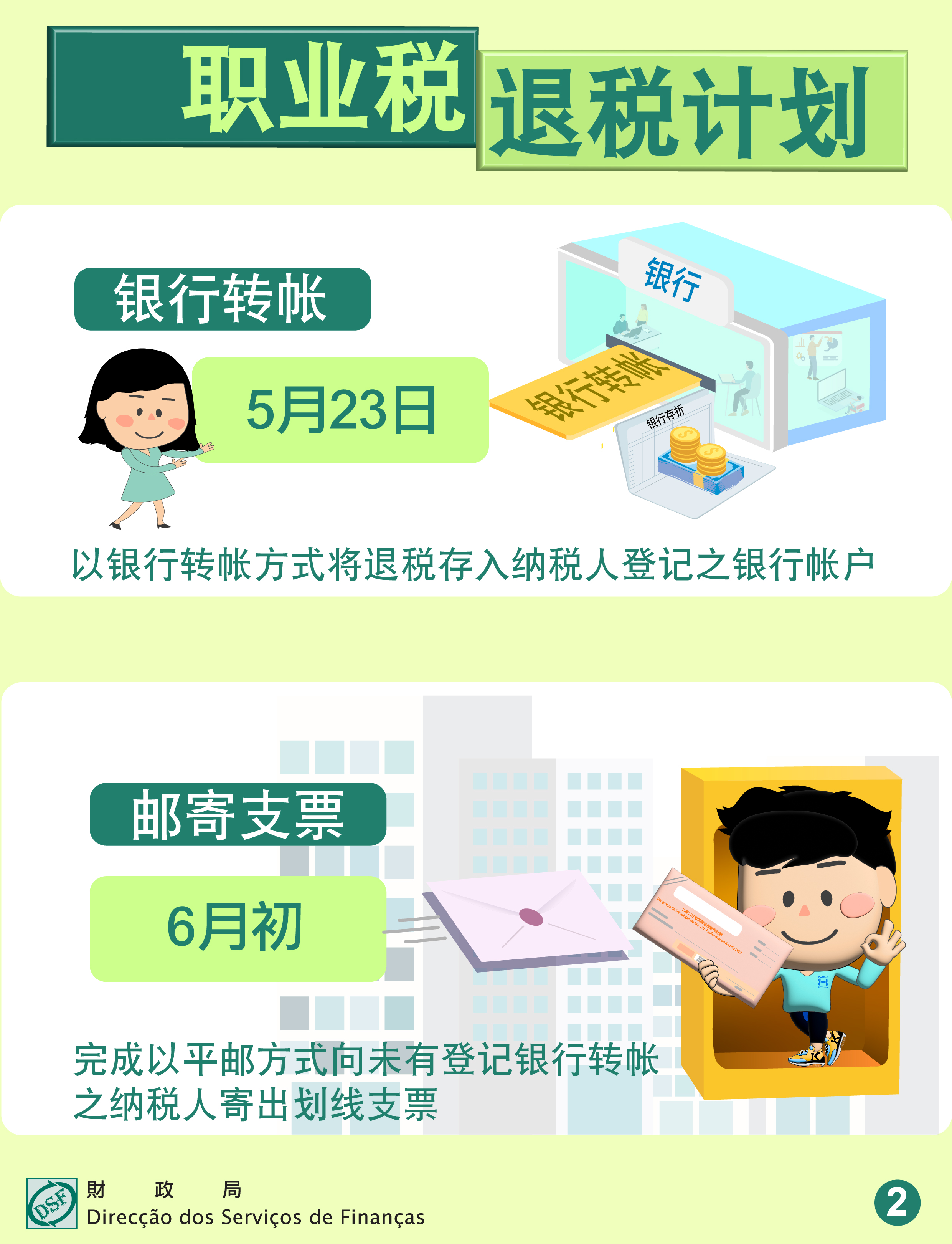 财政局以银行转帐或邮寄划线支票方式发放退税款项,于5月23日将退税款存入已登记银行转帐的纳税人银行帐户内,而未有登记银行转帐的纳税人则按照纳税人在财政局职业税登记的税务通讯地址陆续邮寄划线支票,预计寄送划线支票工作于6月初完成。