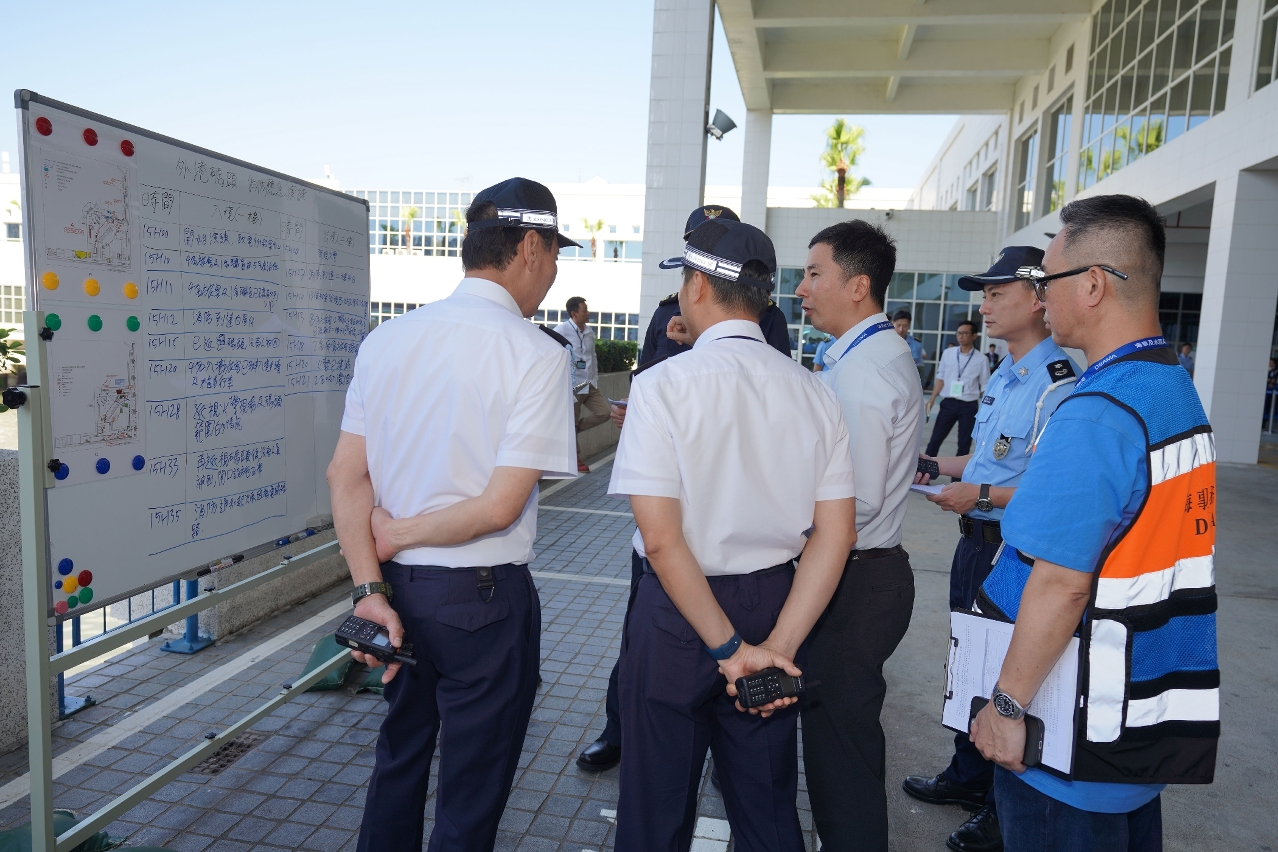 演习于今日下午三时至四时半在外港客运码头举行,演习模拟候船室检票柜台上的电脑着火焚烧及有浓烟冒出,并有蔓延迹象,现场附近的候船室有8名乘客等待登船,地面层也有4名乘客准备登岸入境。船公司人员立即通知保安,并即时通报海关、治安警察局及海事及水务局,海事及水务局通报报案中心。