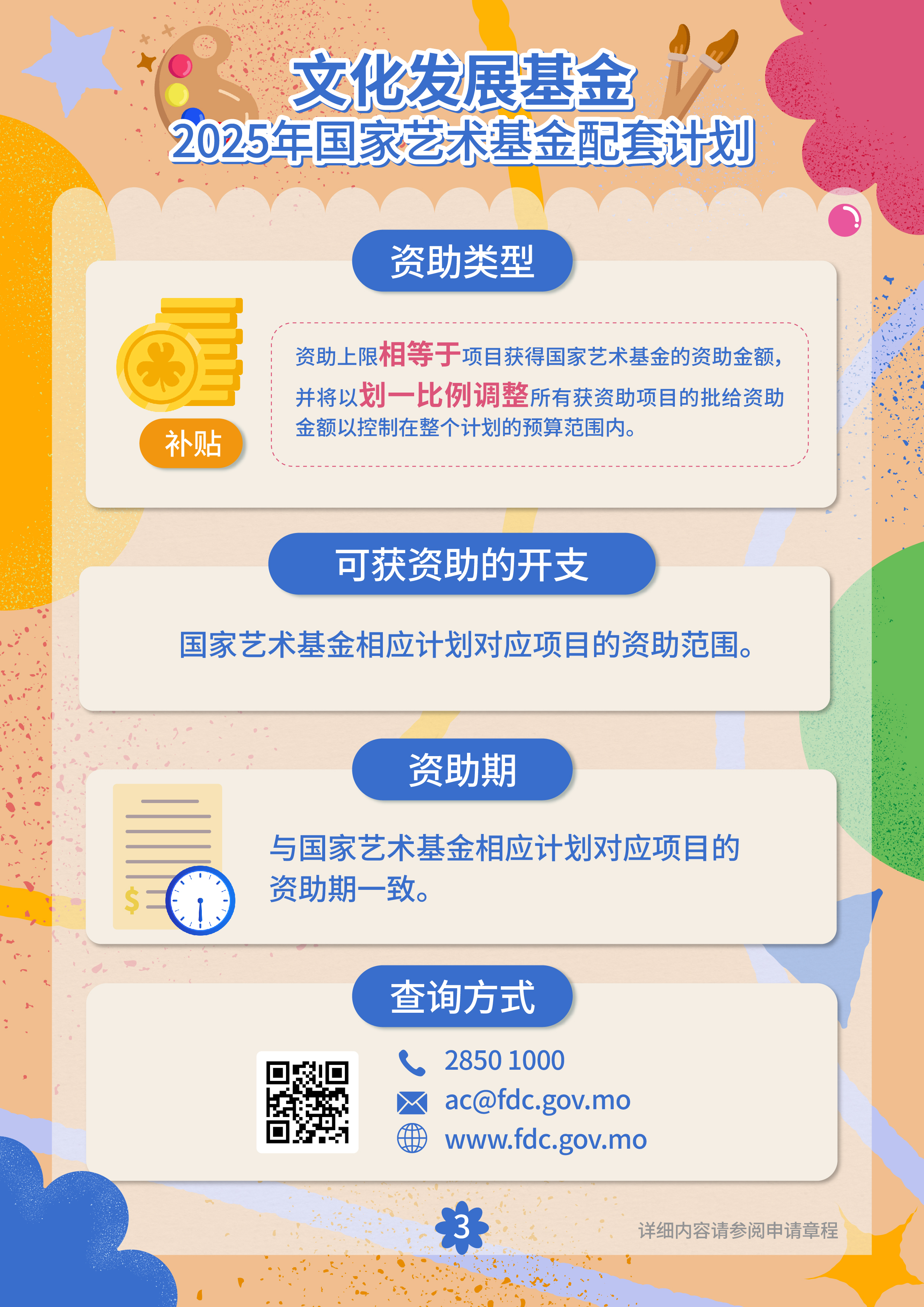 资助计划采用补贴形式,名额不设上限。为进一步支持本澳获国家艺术基金资助的项目顺利推进,2025年文化发展基金将加大配套资助力度,比例由原来的50%提升至1:1,同时资助范围及资助期保持与国家艺术基金资助的项目一致。申请详情请参阅资助计划章程,如有疑问,欢迎致电2850 1000或电邮ac@fdc.gov.mo查询。