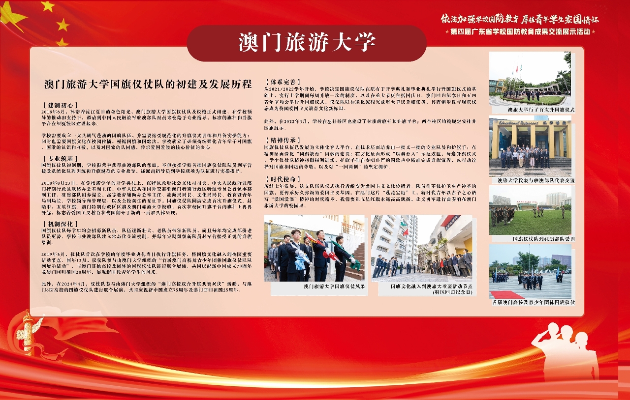 此次活动由广东省教育厅、 广东省军区战备建设局、 广东省军区动员局、共青团广东省委员会联合举办,吸引粤港澳三地160多所院校、逾6,500名师生代表参与共襄盛举。澳门旅游大学学生国旗仪仗队透过图文展板,呈现队伍自2018年成立以来的训练日常及重大活动参与,吸引了众多参观者驻足瞭解和交流。这次参展不仅是澳门旅游大学国防教育成果的首次对外展示,更为粤港澳大湾区青年教育合作搭建了桥梁。