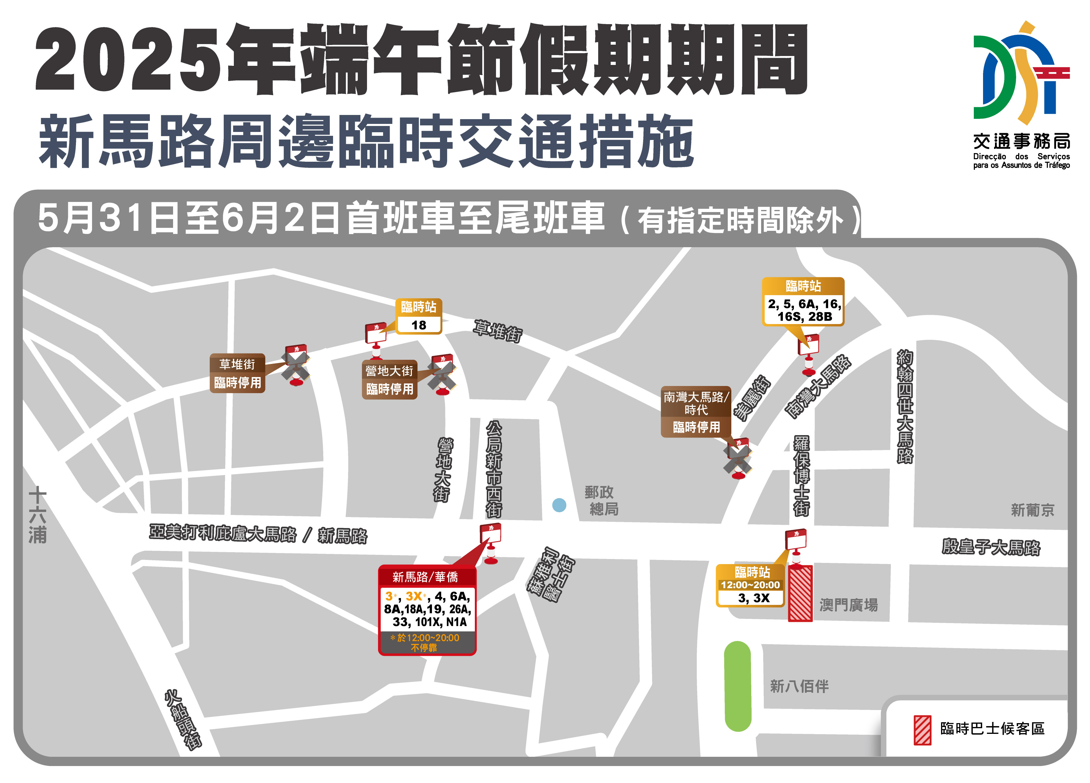 巴士方面,关闸广场东侧、新马路及周边区域参考过往节假日分流方案实施临时措施;两间巴士公司因应假日增加服务班次,并于5月31至6月2日营运时节性路线3BX、17T、21AT及26AT路线,以加快疏导乘客;配合有关安排,周边道路需实施临时交通管制措施(详见附表一)。有关巴士服务临时安排详情,可留意附表二、附表三及两巴网页(澳巴:http://www.tcm.com.mo、新福利:http://www.transmac.com.mo)。