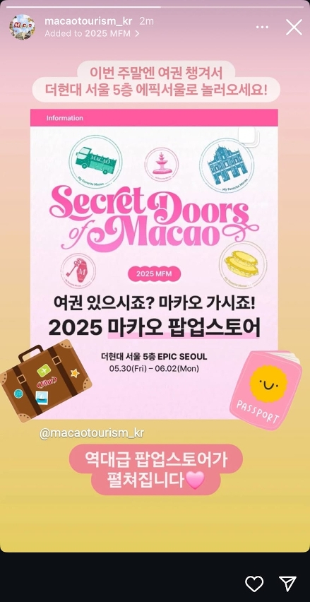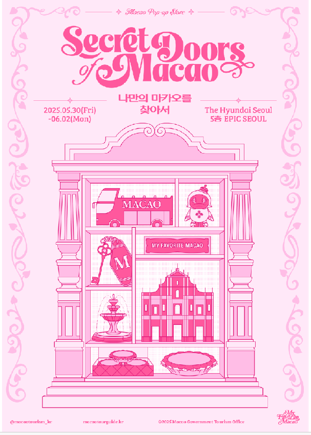 THE现代首尔是首尔最大型购物中心,曾是人气韩剧的取景地及知名歌手的媒体展览场地。旅游局将一连四天带来“澳门秘密之门”快闪店,延续去年在韩国的宣传主题“My Favorite Macao”,并以“浪漫”为切入点,设计互动游戏、打卡装置和精彩演出等,让韩国居民和旅客探索澳门五大浪漫旅游体验。