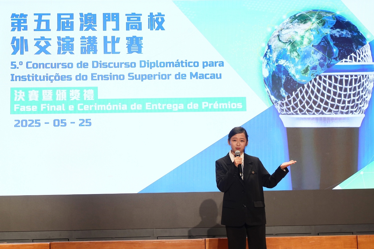 澳大学生陈若晴在第五届澳门高校外交演讲比赛决赛中表现出色,荣获冠军。比赛吸引了澳门八所高校约170名学生的热情参与,经过层层选拔,八位优秀选手晋级决赛。