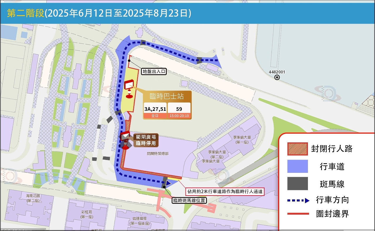 此阶段主要施工内容包括拆卸办公楼,围封局部行人道,并设置临时行人通道。施工期间,关闸广场实施有限度通车,禁止车辆停泊关闸广场近关闸原特警总部大楼的路段以用作设置临时巴士站。(详见附图1)