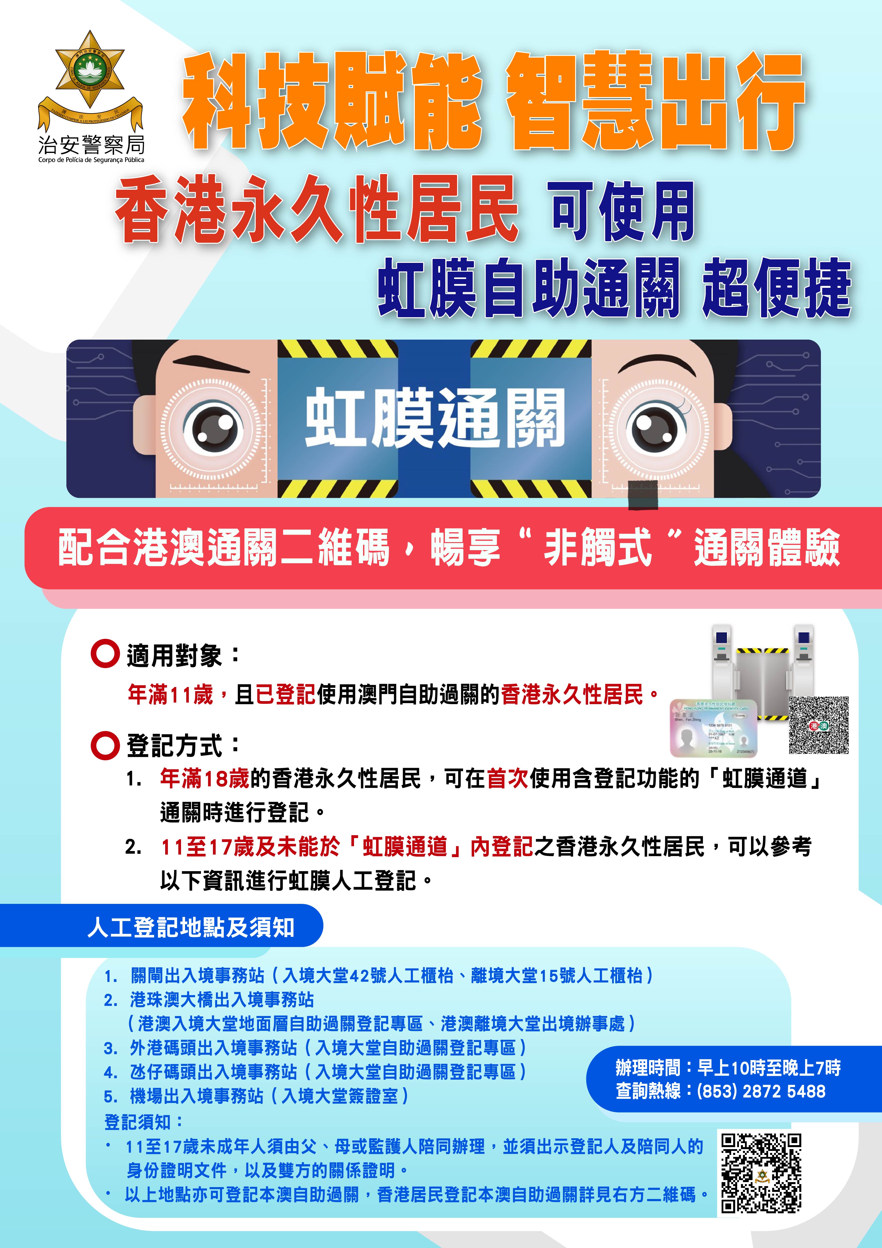 随着大湾区的加速发展,港澳居民交流越趋频繁,为进一步便利香港居民来澳,继于去年8月“港澳居民互用通关二维码”通关便利措施成功实施后,治安警察局将自2025年6月11日中午12时起,扩展虹膜通关的适用对象至已登记使用本澳自助过关的香港永久性居民。