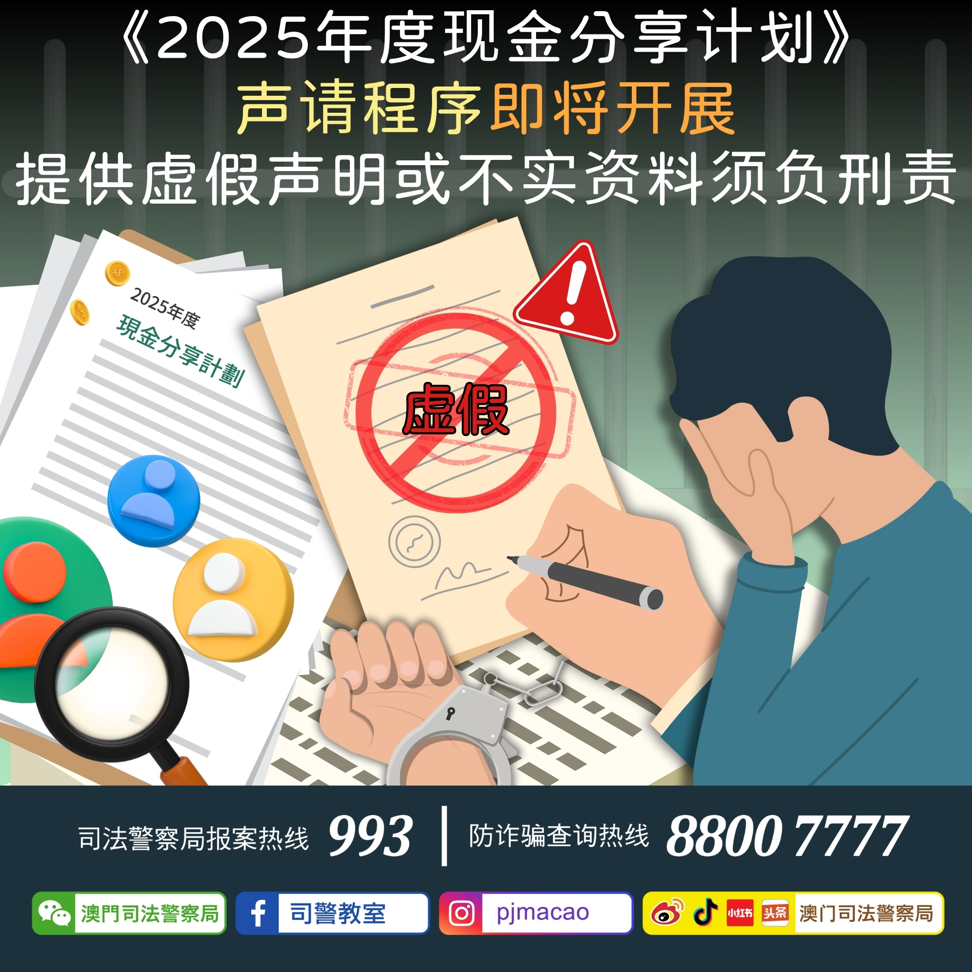 司法警察局提醒,不论以何种方式向社会保障基金提交声请,相关证明文件均须接受审核。此外,如故意提交虚假声明、不正确或不实资料,使用伪造文书,盗用他人身份,或以其他非法手段获取现金分享款项的行为,受惠人除了须全额退还不当取得的款项外,还须承担相应的刑事责任,呼吁居民切勿以身试法。