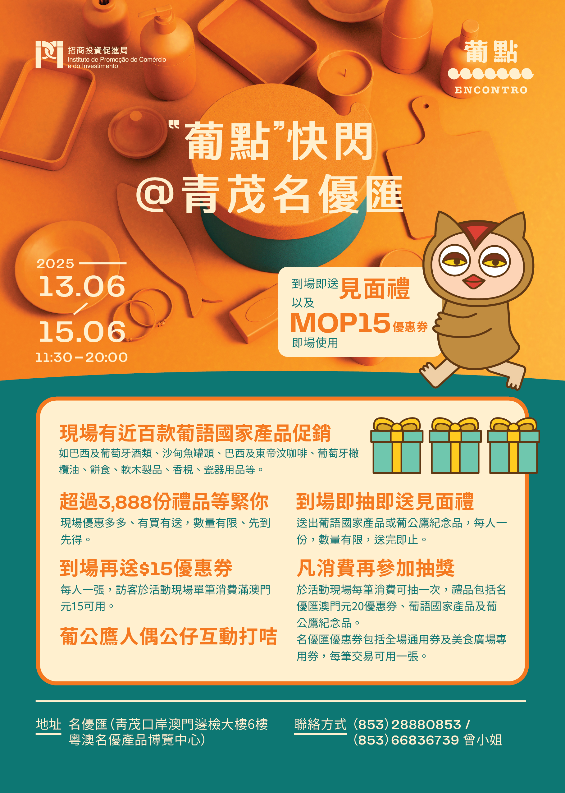 “葡点”快闪@青茂名优汇活动于今(13)至15日展开,是招商投资促进局继5月举办澳门好货展销专场后,再次于青茂口岸澳门边检大楼6楼“粤澳名优产品博览中心”组织的促销活动。此次活动除设“葡点”快闪店,更携手12家代理葡语国家产品的澳门企业带来过百款葡语国家产品,于现场设置消费“优惠三步曲”体验,免费派发超过3,888份好礼等系列安排。诚邀公众于本周五至日的上午11时30分至晚上8时亲临选购心仪好物。
