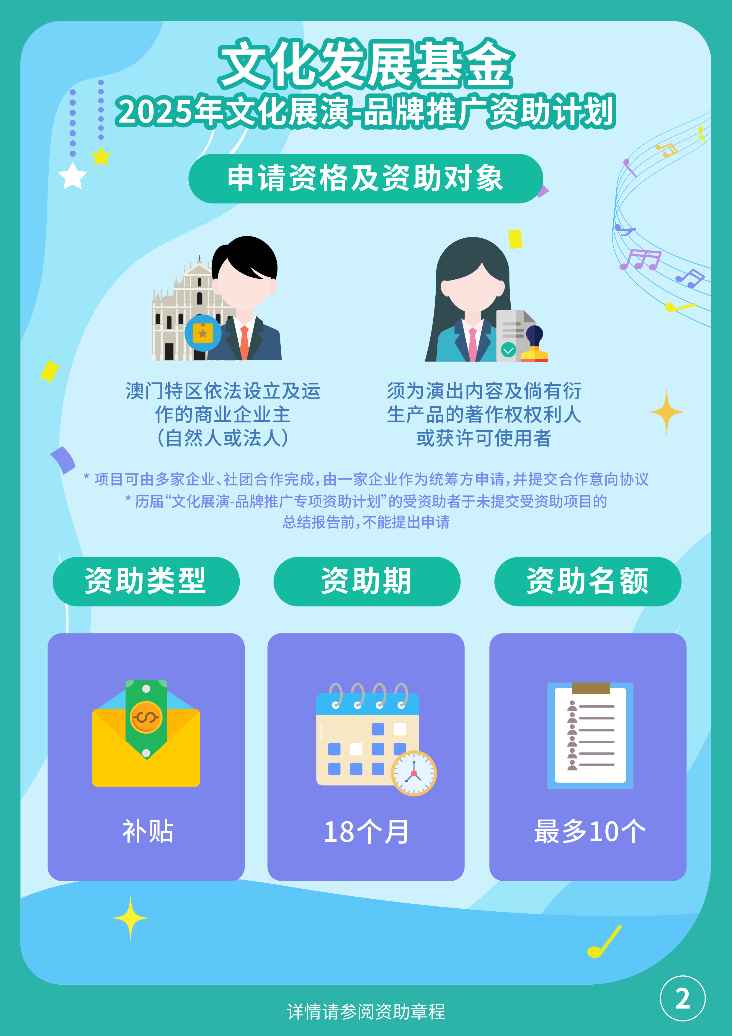 资助计划申请期为6月17日至8月15日,主要支持戏曲、戏剧、舞蹈、音乐、魔术等舞台表演内容,并鼓励跨领域融合的演出项目。申请人须为澳门特区自然人商业企业主或法人商业企业主,并持有演出内容及倘有衍生产品的著作权或获许可使用权。