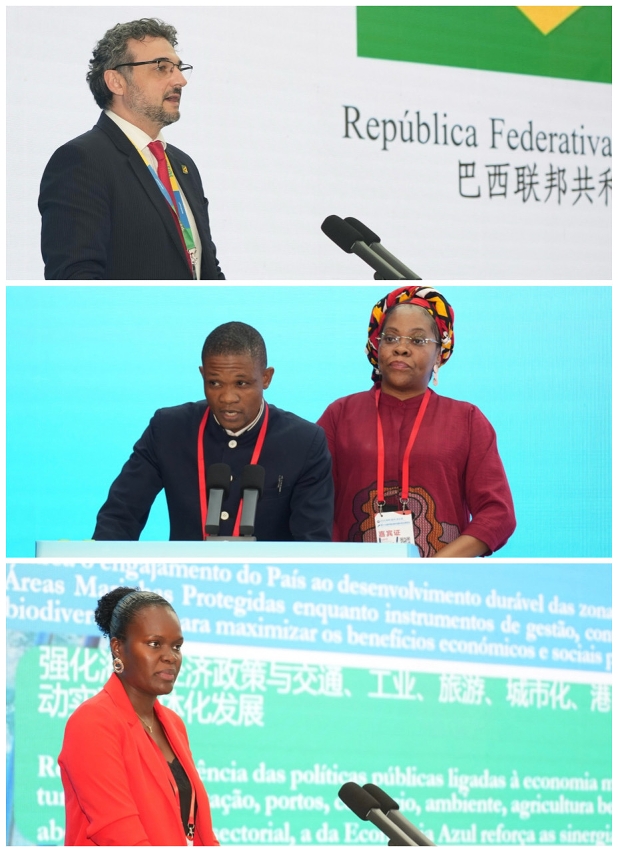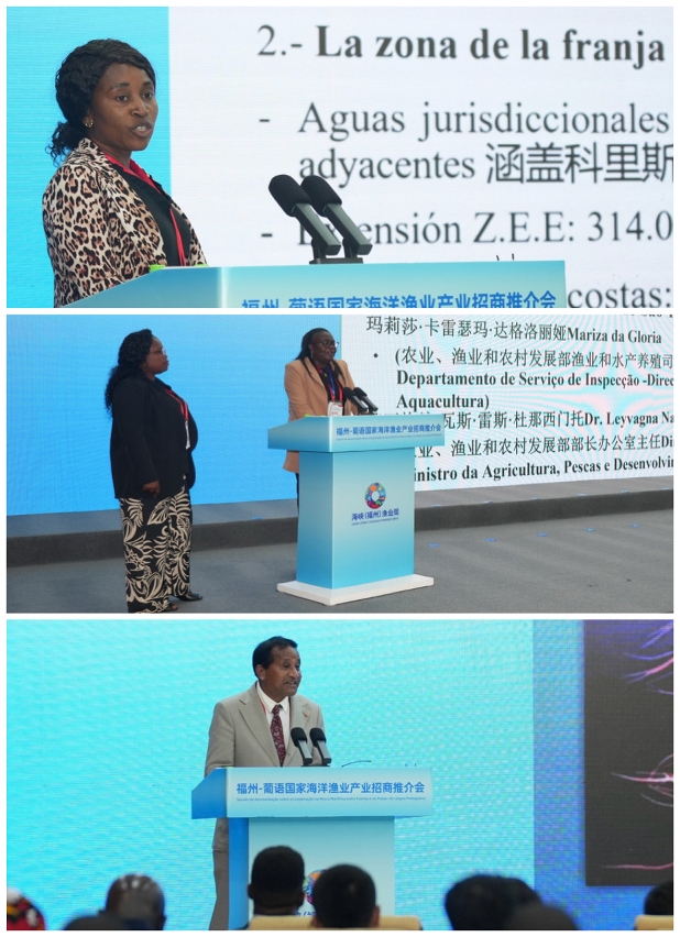 九个葡语国家代表推介了本国海洋经济的政策和商机,福州市渔业重点园区连江县、福州元洪投资区、马尾深海时代产业园介绍了深远海养殖优势、智能冷库、水产加工等情况,宏东渔业股份有限公司、宏龙海洋水产有限公司、正冠渔业开发有限公司介绍了远洋捕捞、养殖加工的先进技术及经验。