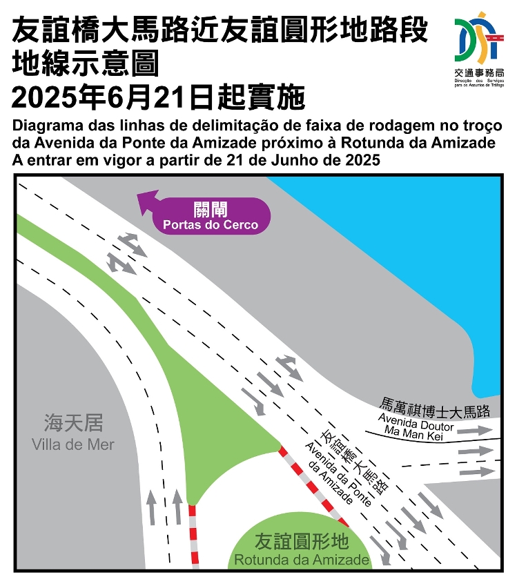 考虑到进入新城A区和港珠澳大桥人工岛之车流日渐增加,为提前部署及让驾驶者适应路况,交通事务局于4月底调整友谊桥大马路近友谊圆形地(往新城A区及友谊大桥方向)路段之地线,以增加可转往A区的行车道,疏导该处车流。经听取社会意见、检视有关交通情况,并与交通执法部门沟通,上述路段由6月21日(周六)起恢复早前的地线安排,即左线可转往A区或直行往友谊大桥、中线仅可直行往友谊大桥、右线则仅可右转入友谊圆形地。