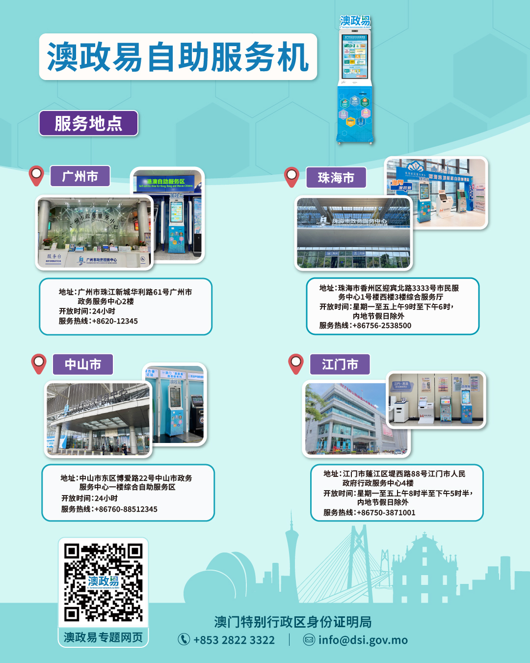 “澳政易”自助服务机分别设于广州市珠江新城华利路61号广州市政务服务中心2楼、珠海市香州区迎宾北路3333号市政服务中心1号楼西楼3楼综合服务厅、中山市东区博爱路22号中山市政务中心一楼综合自助服务区,以及江门市蓬江区堤西路88号江门市人民政府行政服务中心4楼。