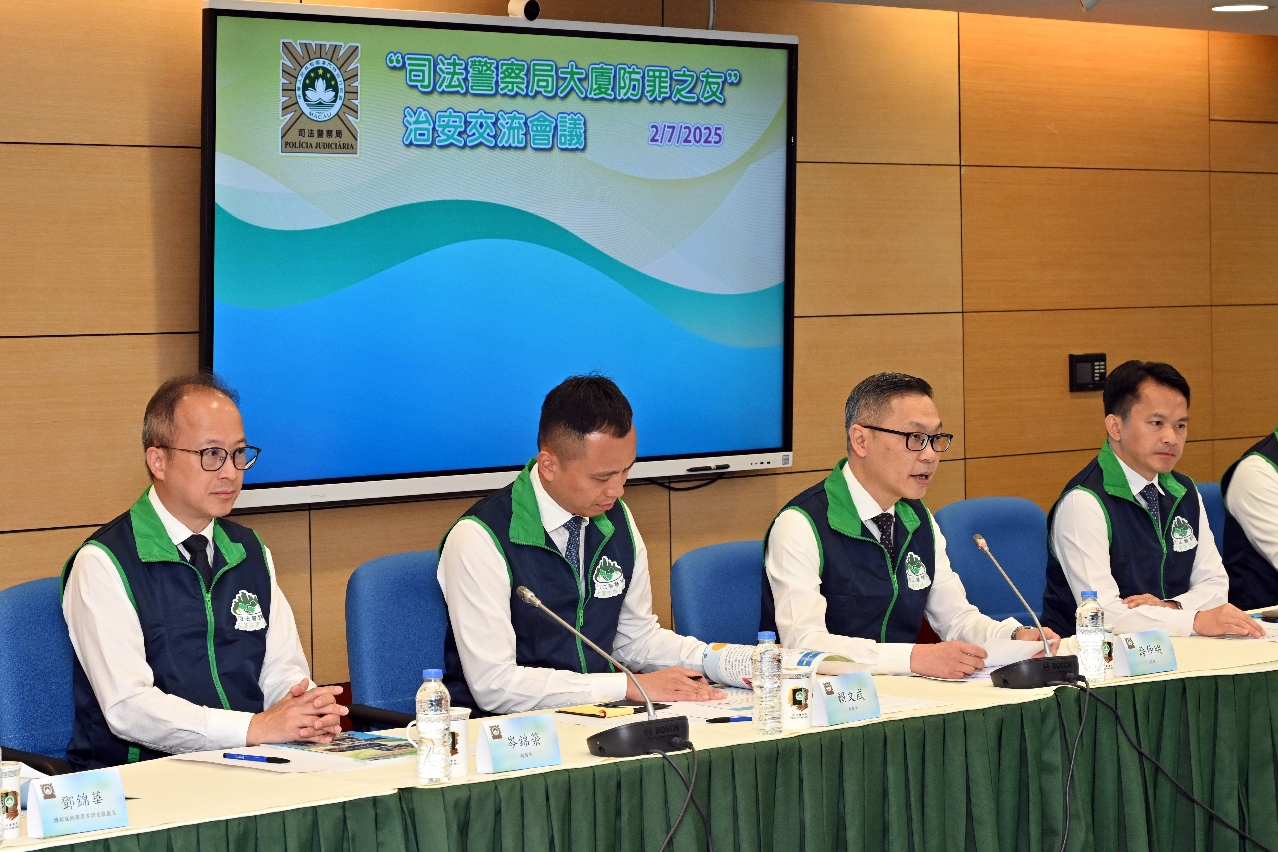 交流会于7月2日上午在司警局总部大楼举行,“司警局大厦防罪之友”总召集人及澳门物业管理业商会永远会长刘艺良先生、澳门工会联合总会何雪卿会长、澳门街坊会联合总会陈家良理事长、澳门归侨总会赵文炎副会长、澳门妇女联合总会吕绮颖副理事长、民众建澳联盟李良汪理事长、澳门物业管理业商会谢思训会长、澳门不动产管理专业技术人员协会仇坤仪会长、澳门物业管理专业人员协会周嘉进会长,以及逾50名“司警局大厦防罪之友”成员代表等嘉宾应邀出席,与司警局薛仲明局长,赖文威、苏兆强及岑锦荣三位副局长,以及多位厅处级主管进行交流。