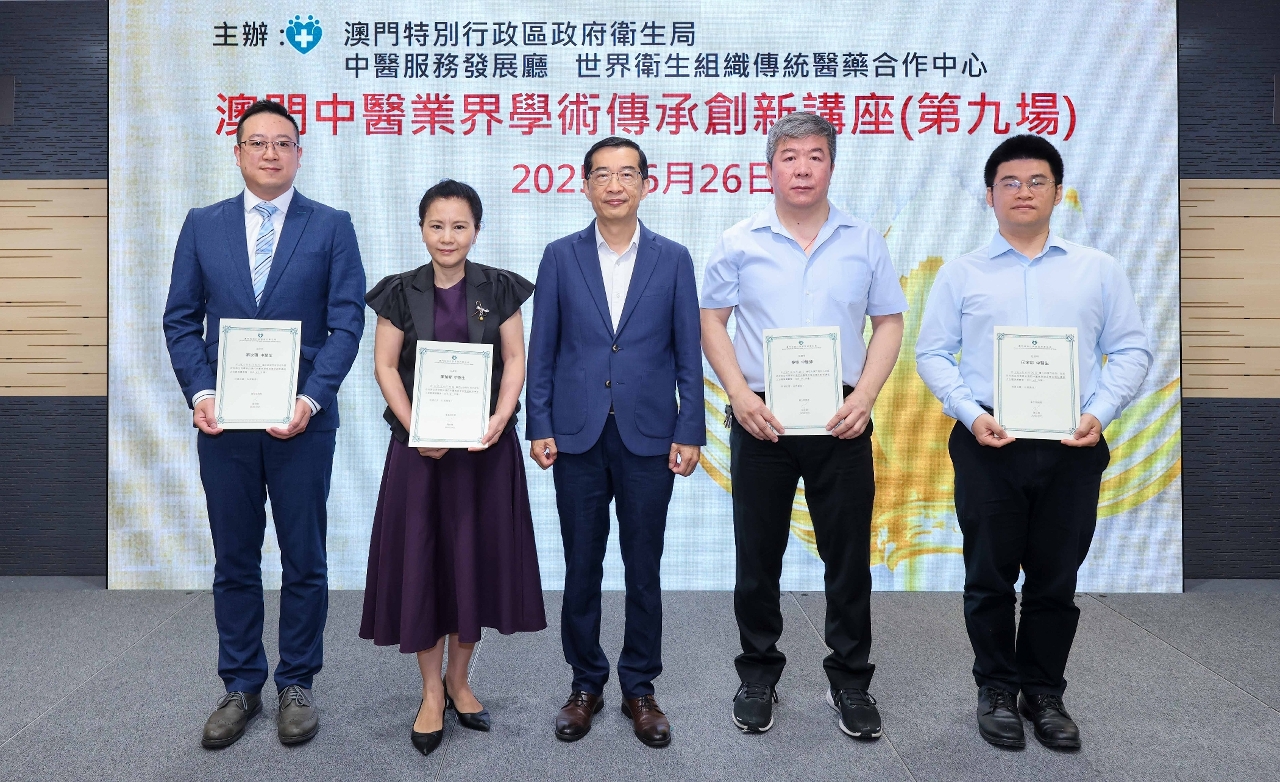 卫生局中医服务发展厅和世界卫生组织传统医药合作中心(澳门)日前共同举办第9场“澳门中医业界学术传承创新讲座”,邀请陈瑞琴、秦振、黎汝硕和何家明4位具丰富经验的本地中医作为主讲嘉宾,与中医业界分享临床经验和交流心得。卫生局郑成业副局长和世界卫生组织传统医药合作中心(澳门)莫蕙主任出席并主持讲座。